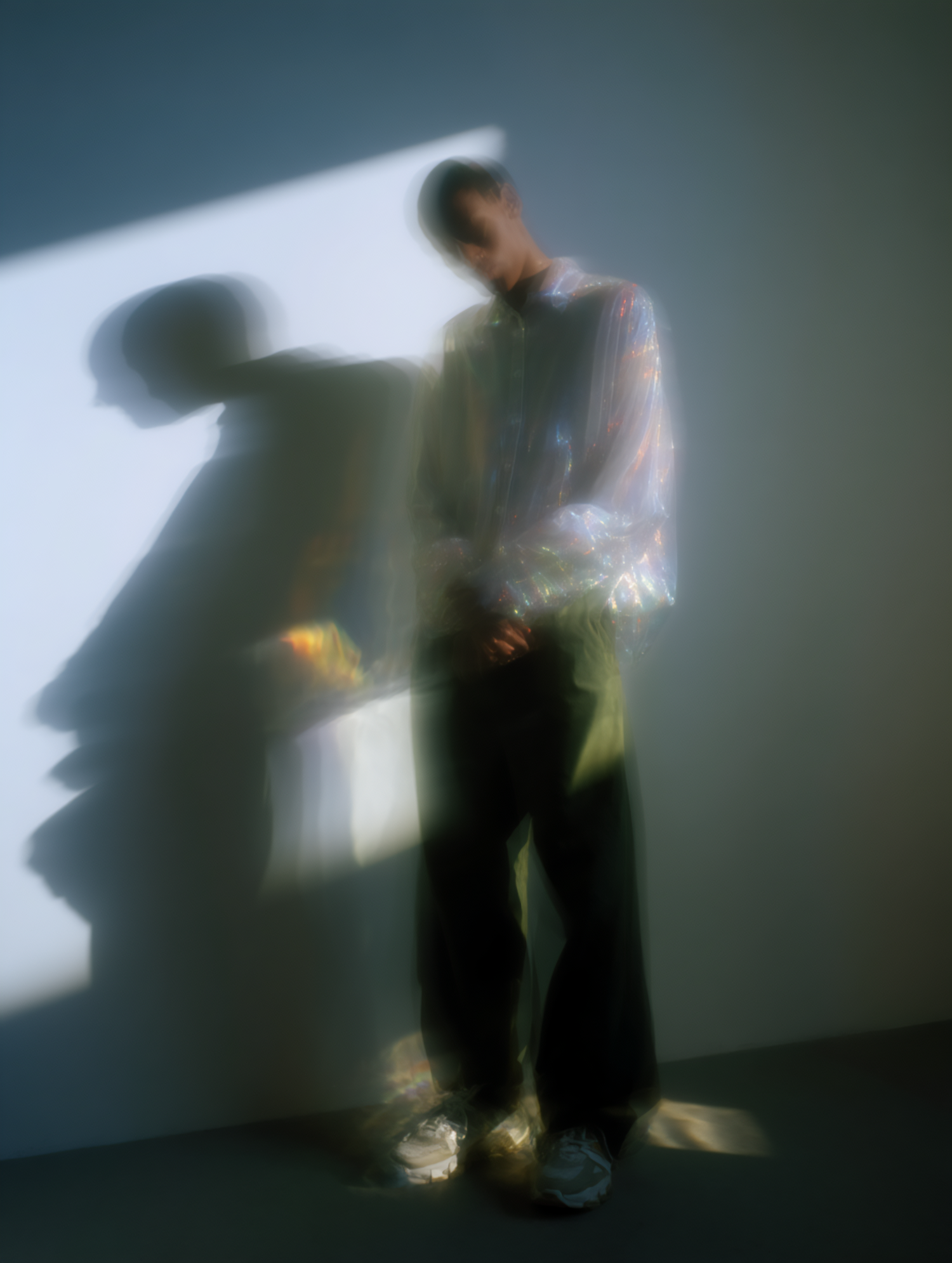 Dreamy, blurred portrait of a person in an iridescent shirt with dramatic shadows and soft lighting for an ethereal vibe.