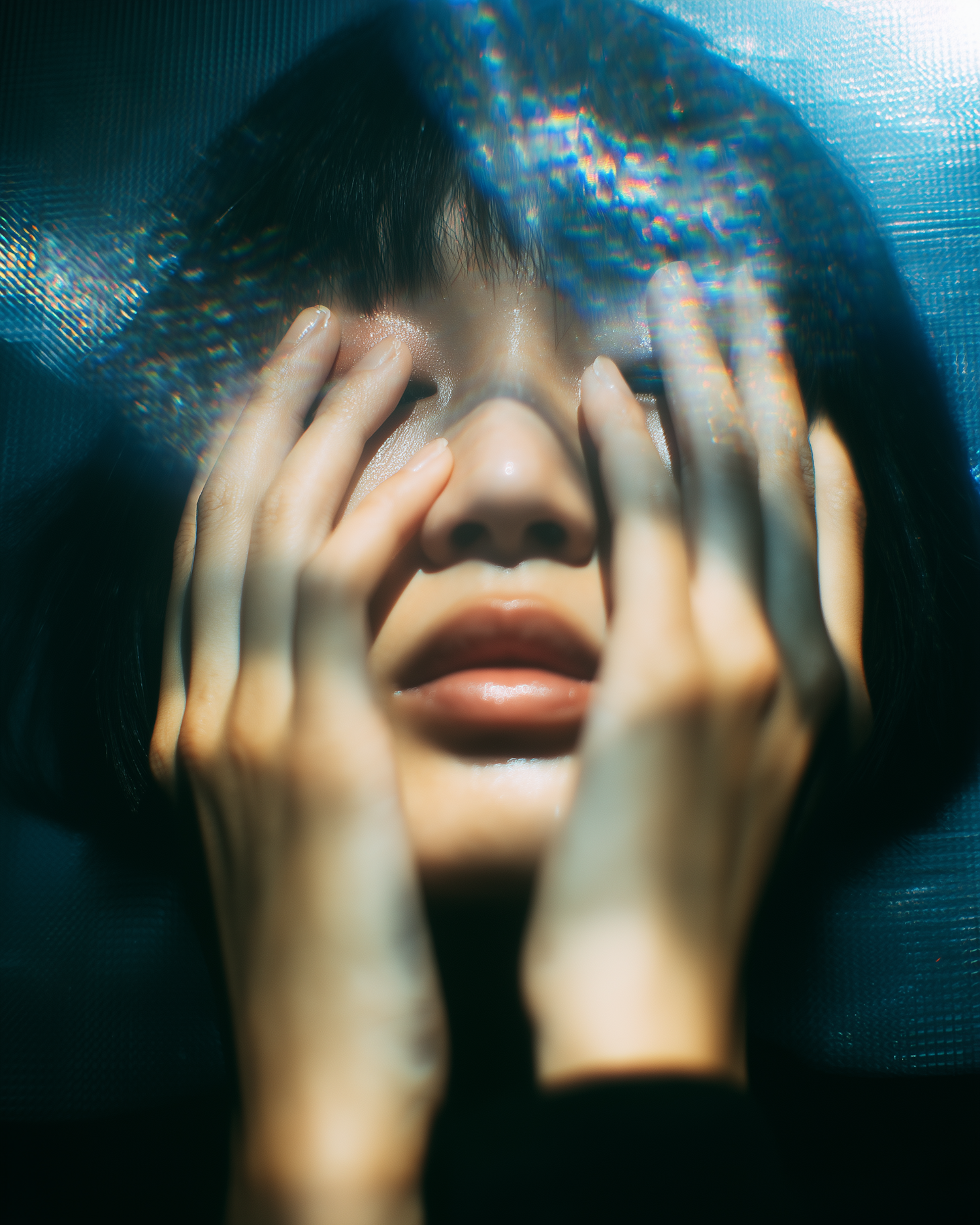 Close-up of a face framed by hands with a prismatic light effect, creating a dreamy and artistic atmosphere.