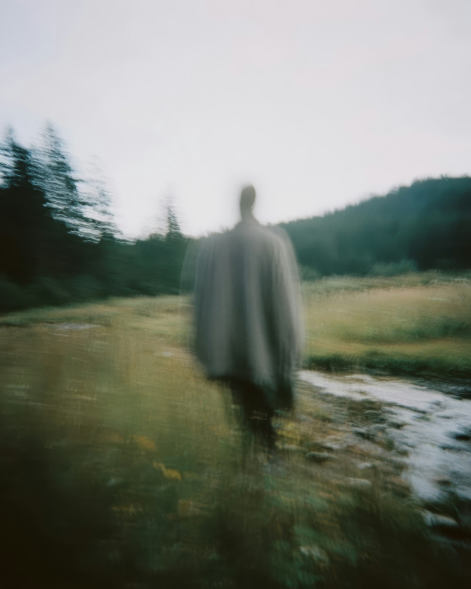 Blurred figure walking through a grassy field with a forested hill in the background, evoking a dreamlike and mysterious atmosphere.
