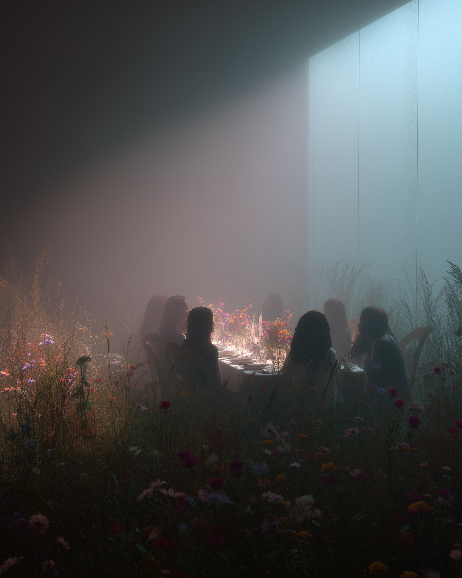 A surreal dinner scene with silhouetted figures, vibrant flowers, and ethereal lighting in a meadow-like setting.