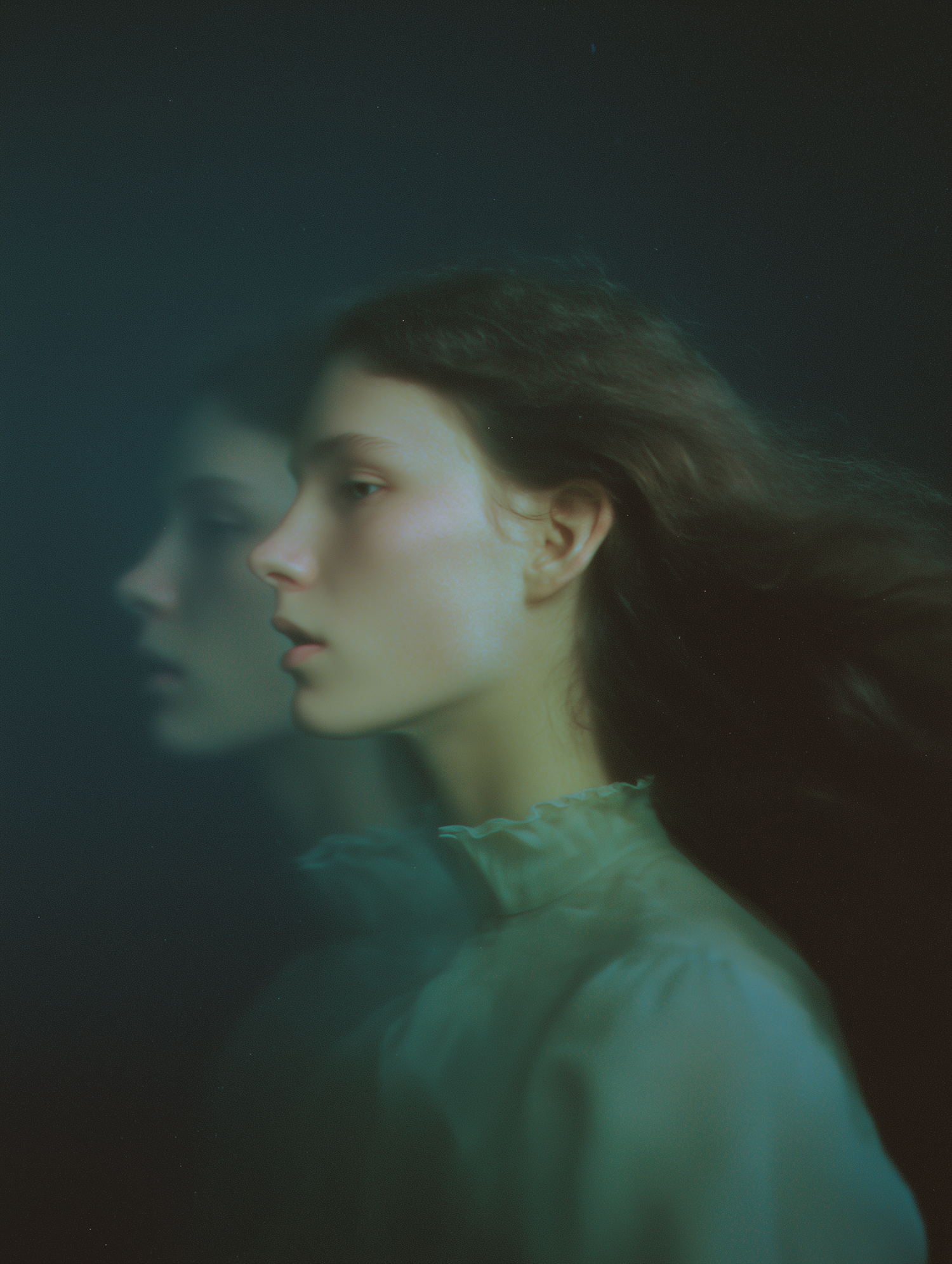 Dreamy portrait of a young woman in profile with soft lighting and a faint reflection, creating an ethereal and introspective mood.