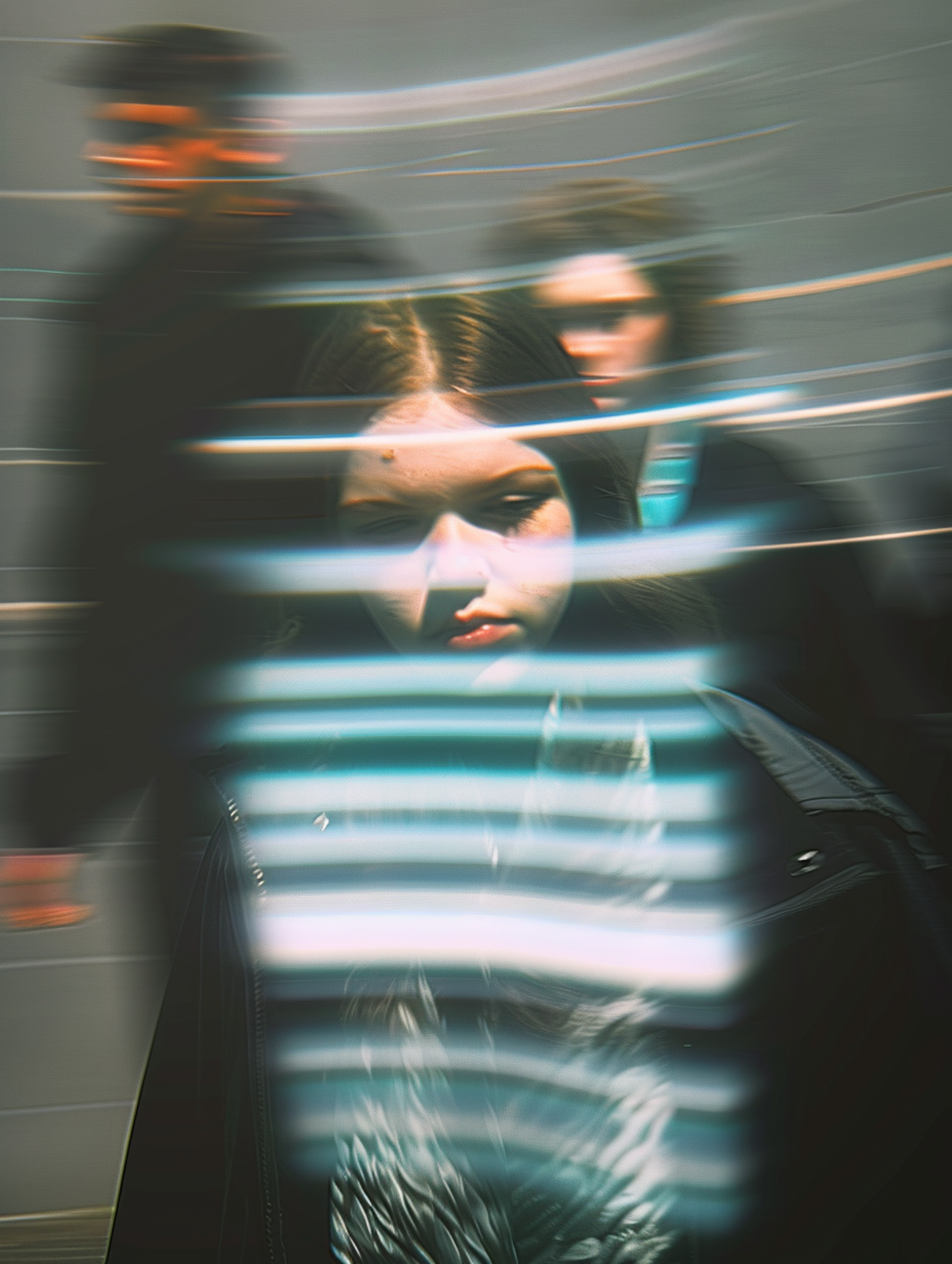 A surreal image of a young woman with light streaks across her face, surrounded by blurred figures in motion, creating an abstract effect.