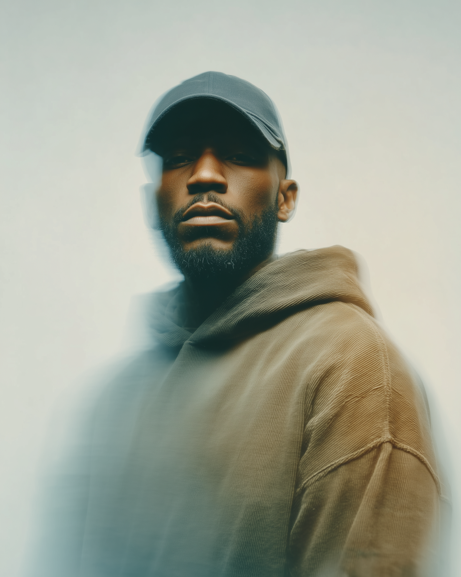 Portrait of a man in a hoodie and cap with a dreamy blur effect, set against a soft gradient background.