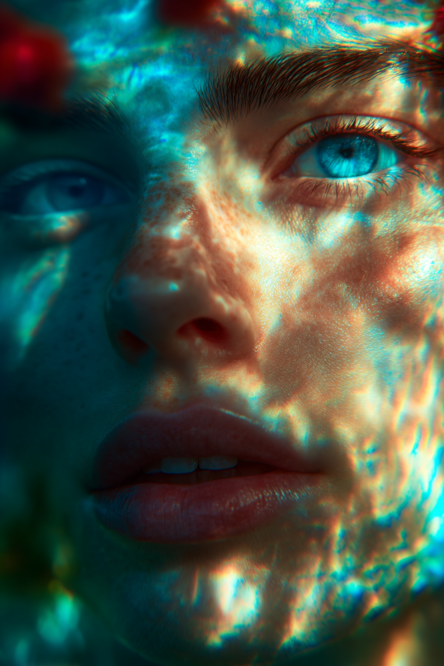 A close-up of a face underwater with refracted light patterns, highlighting blue eyes and textured skin in a surreal, artistic style.