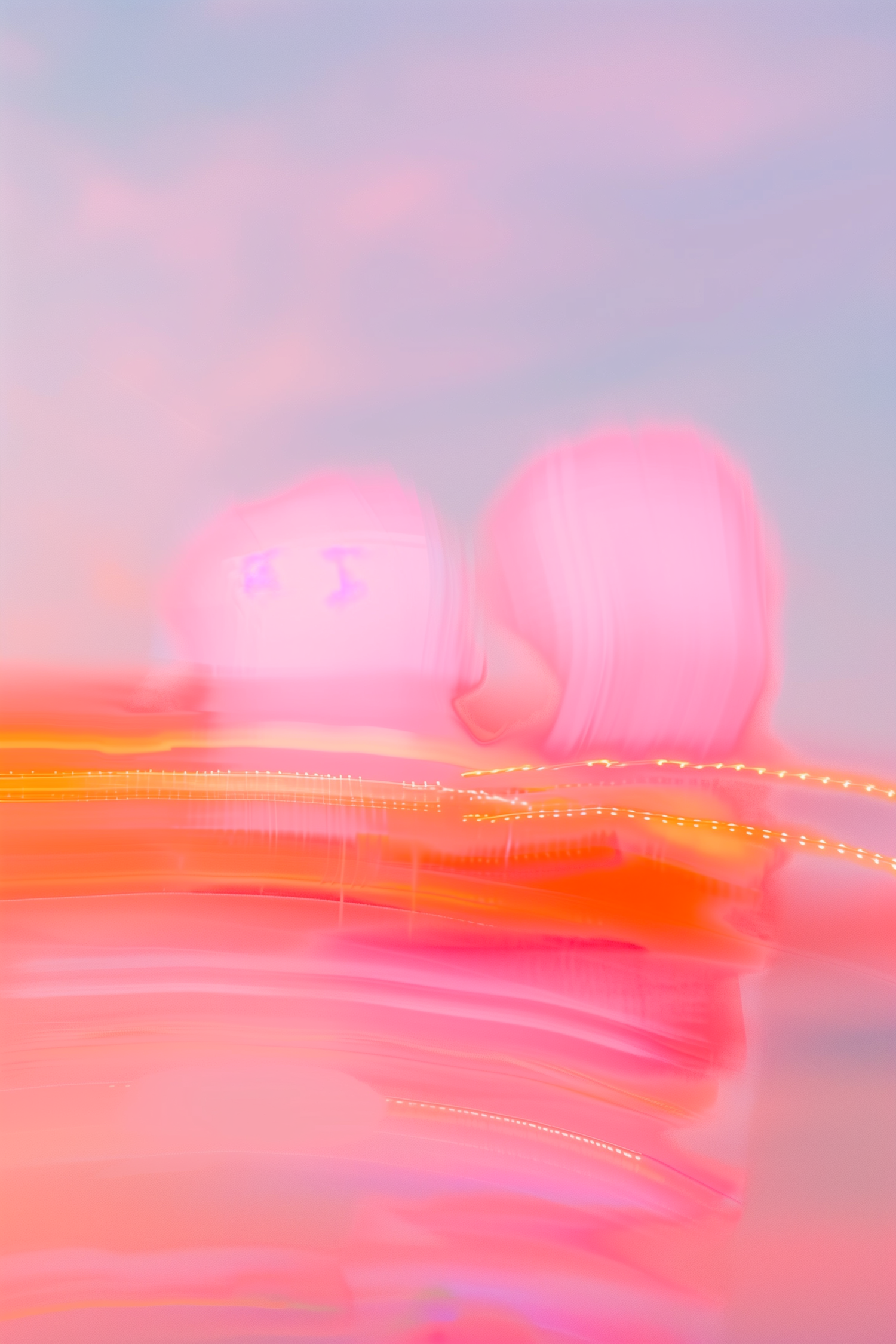 Abstract pink and orange hues with flowing light streaks and a soft blue gradient, creating a dreamy and serene atmosphere.