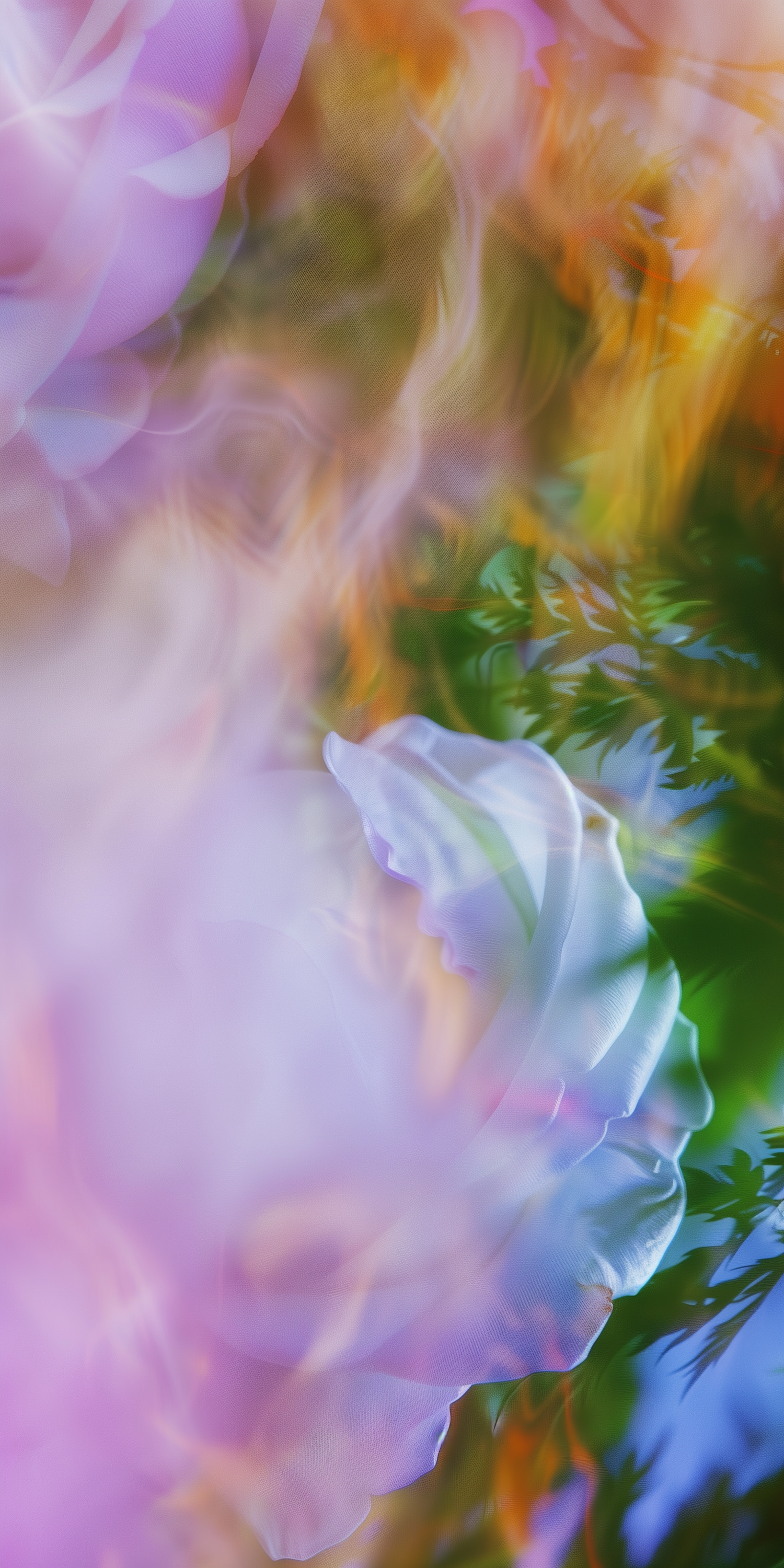 A dreamy abstract blend of pastel pinks, purples, and greens with soft floral details and flowing textures, evoking a serene garden vibe.
