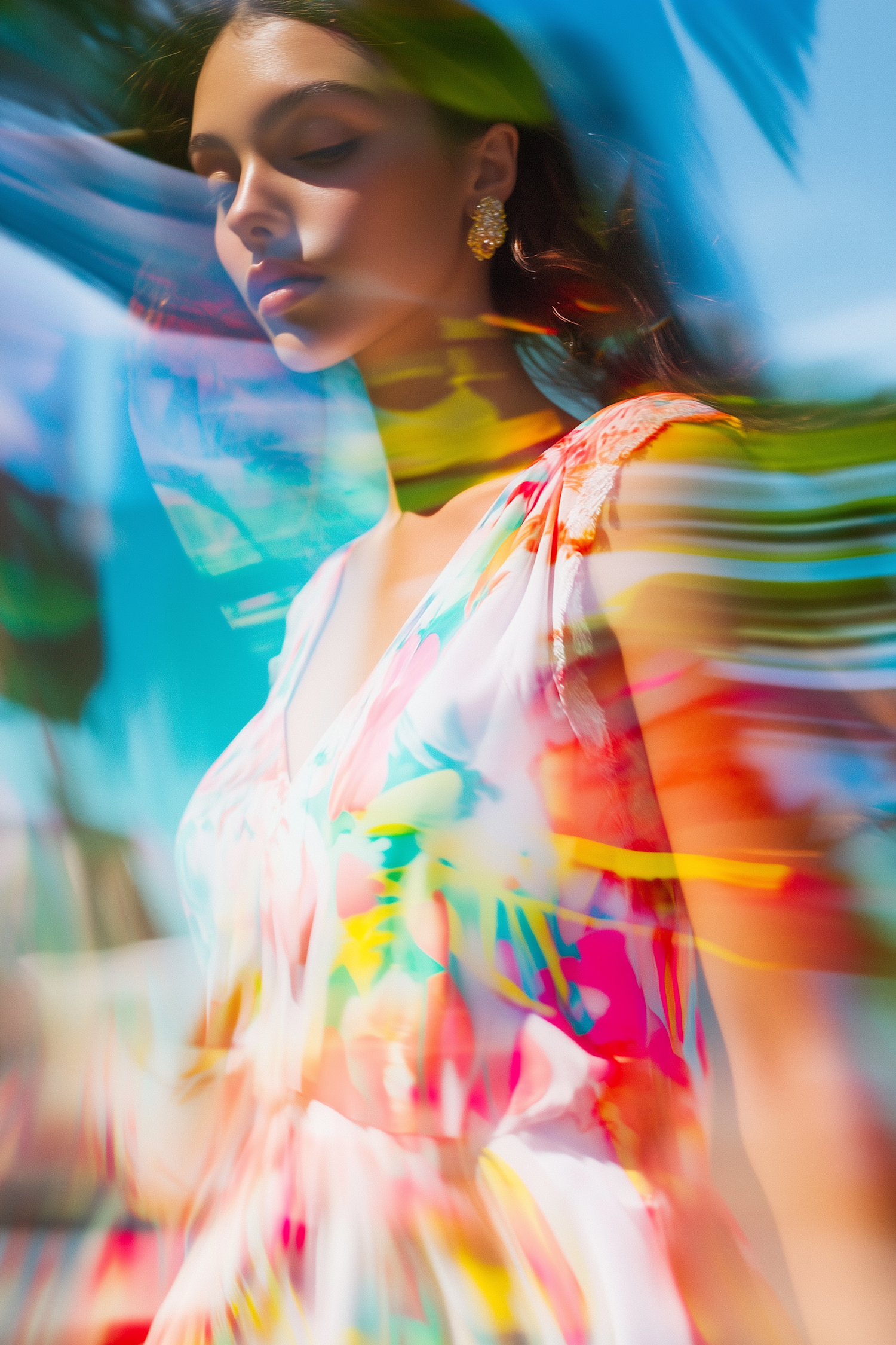 A serene woman in a vibrant floral dress with gold earrings, surrounded by dreamy, colorful streaks and a bright blue sky.