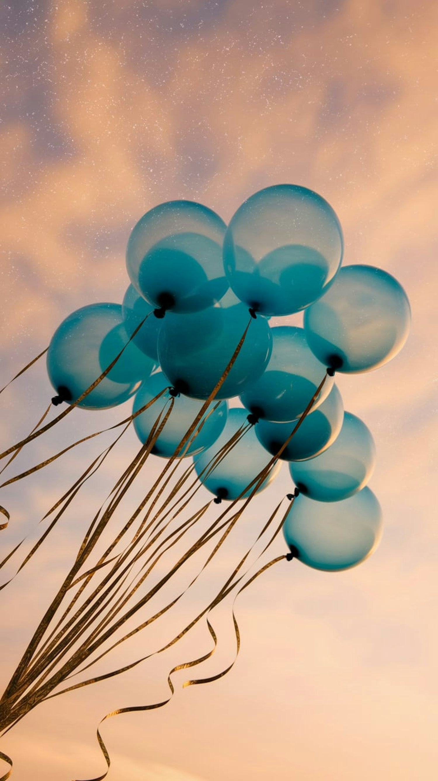 A cluster of light blue balloons with golden ribbons floats against a dreamy orange-pink sky, creating a whimsical and serene vibe.