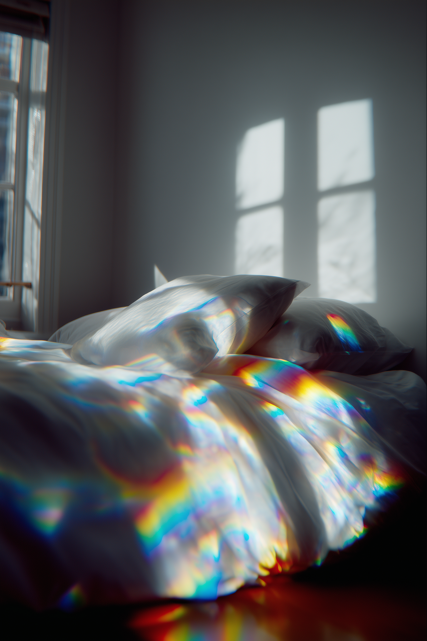 Sunlight streams through a window, casting rainbow hues on a white bedspread in a tranquil, minimalist bedroom.