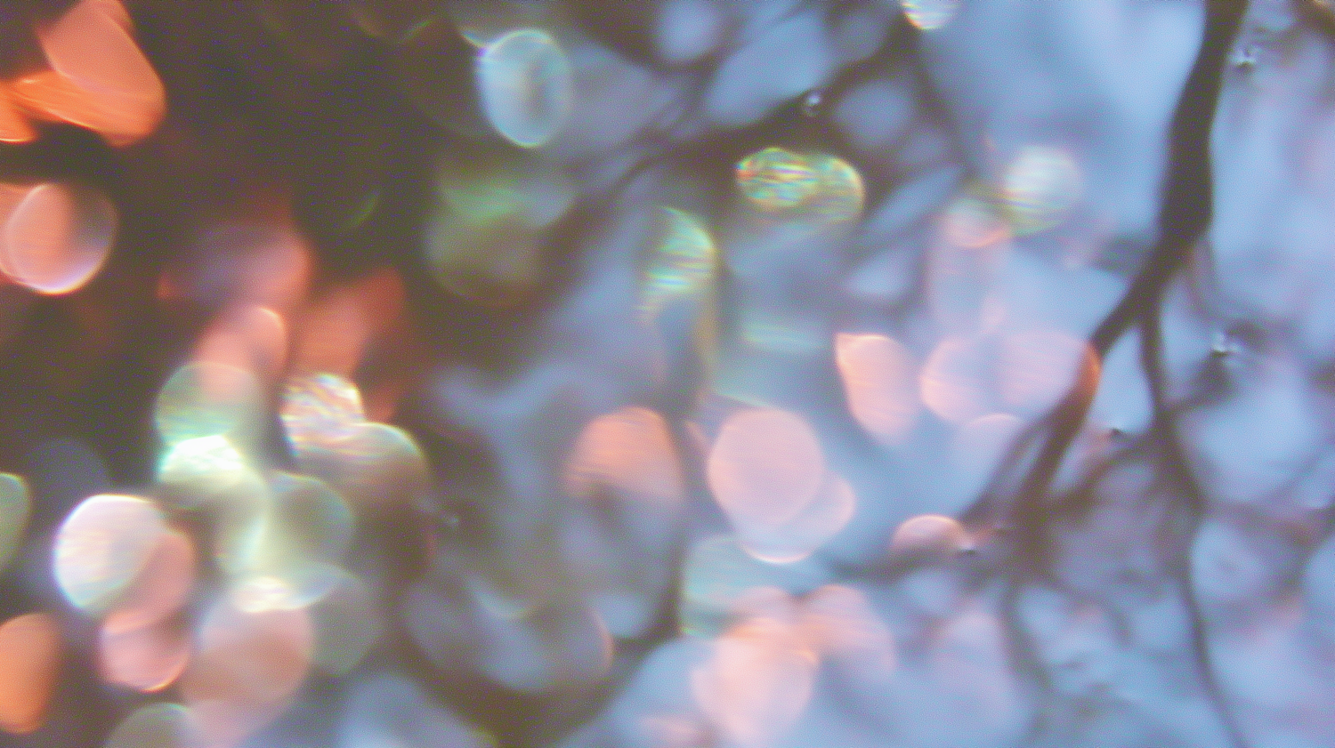Abstract bokeh lights in pastel pink, blue, and green hues with blurred dark lines resembling branches for a dreamy, ethereal vibe.