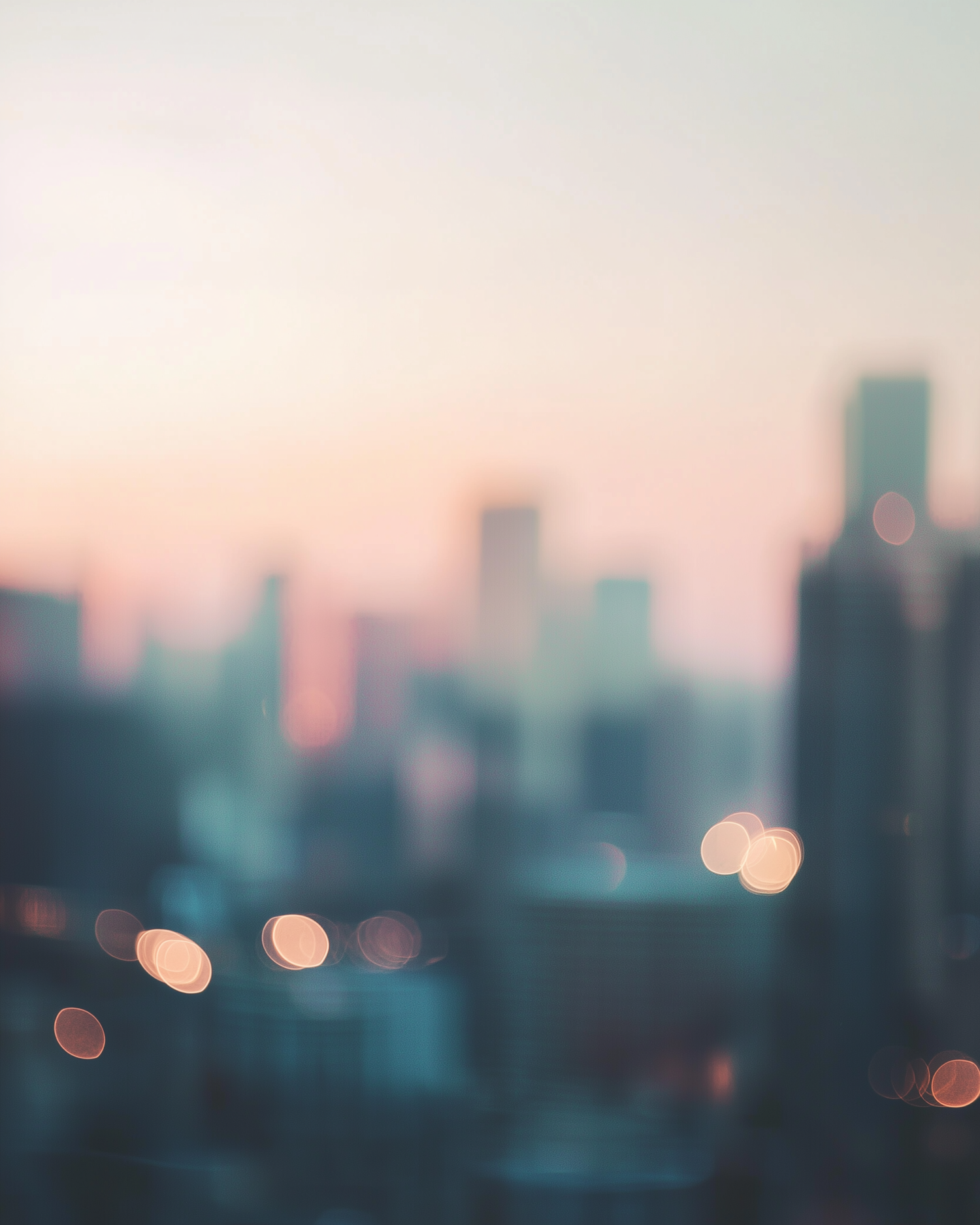 Dreamy blurred cityscape at dusk with pastel skies and warm bokeh lights, creating a serene and abstract urban vibe.