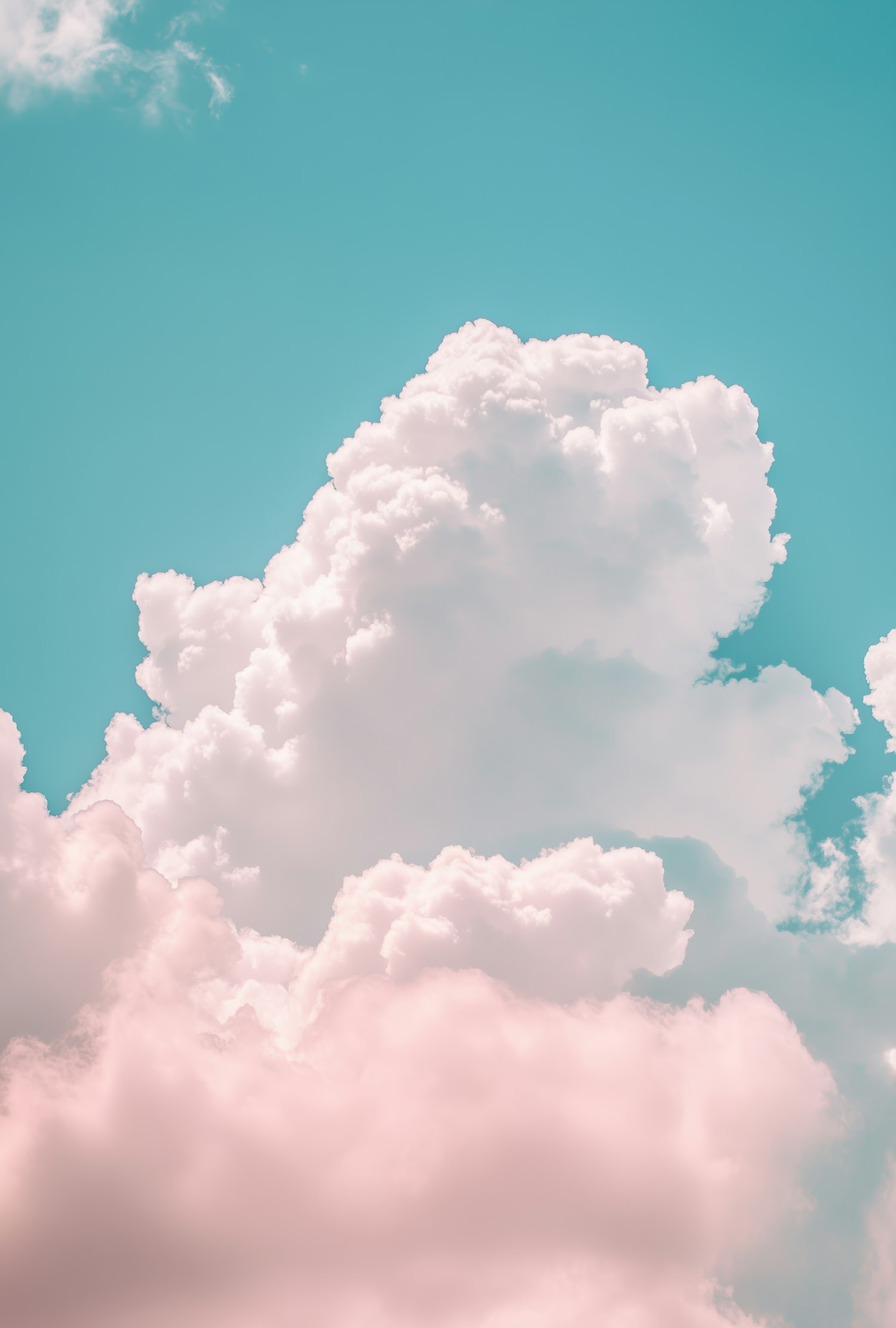 Dreamy clouds in a turquoise sky, blending white and pink hues for a serene, ethereal atmosphere.
