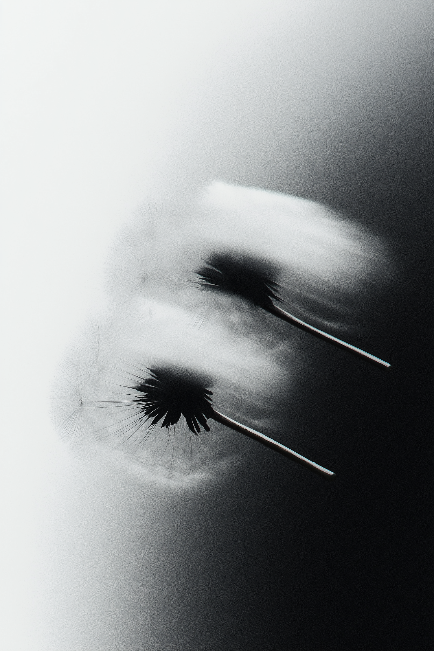 Minimalist black-and-white photo of two dandelions with blurred seeds, creating a dreamy and ethereal effect against a gradient background.