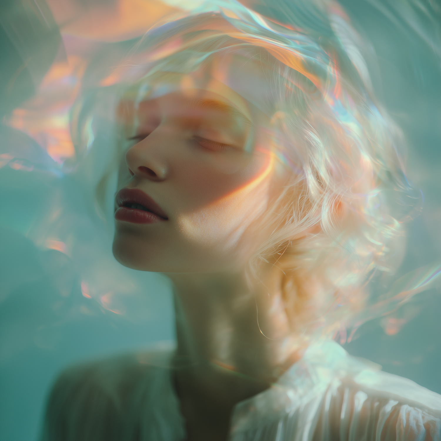 Dreamy portrait of a person with closed eyes, bathed in soft, colorful light reflections, creating a serene and ethereal atmosphere.