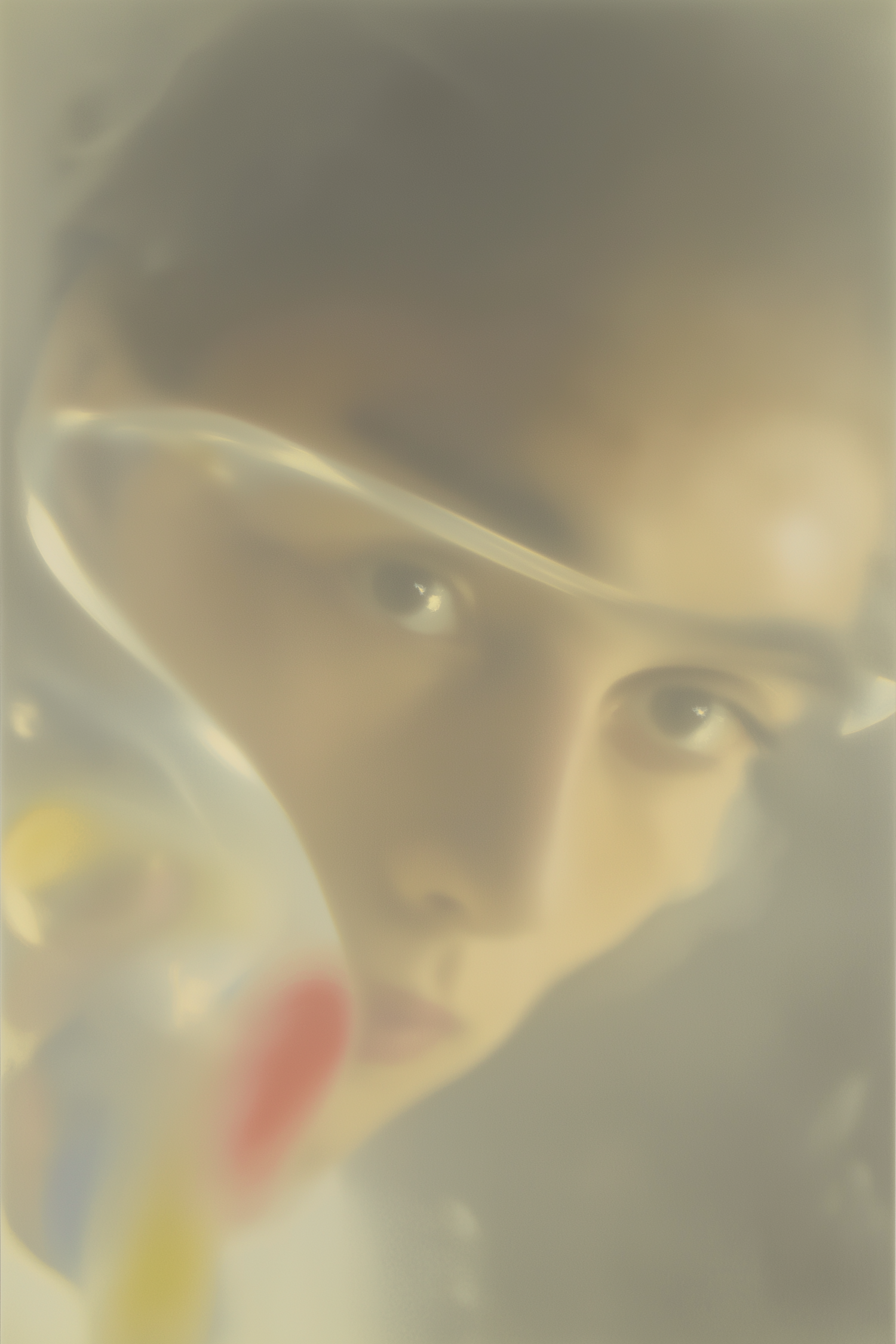 Dreamy, soft-focus portrait with muted tones and colorful abstract shapes, creating an ethereal and artistic atmosphere.