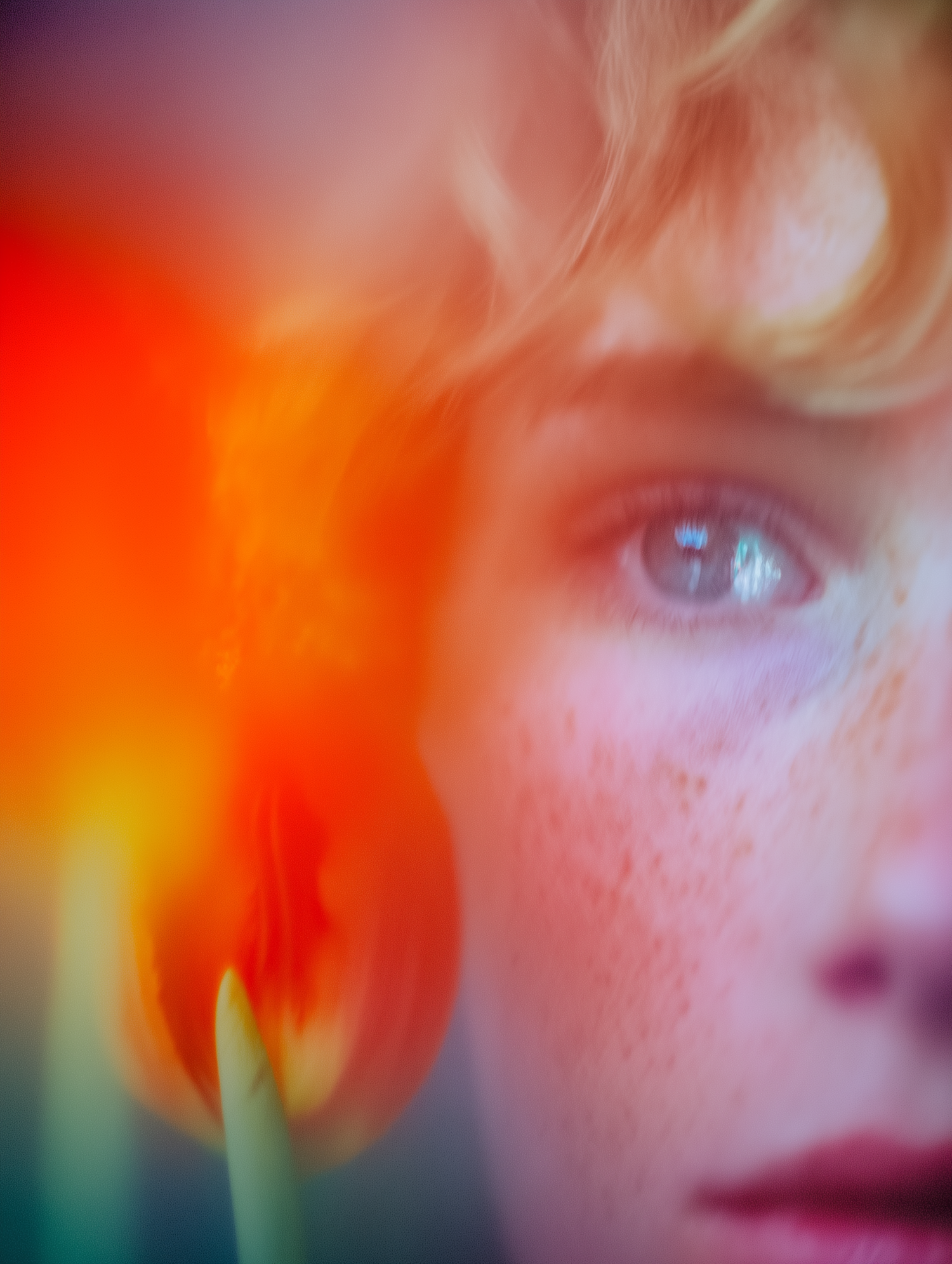 A dreamy close-up of a freckled face with vibrant orange hues and a soft focus, creating an abstract and artistic visual effect.