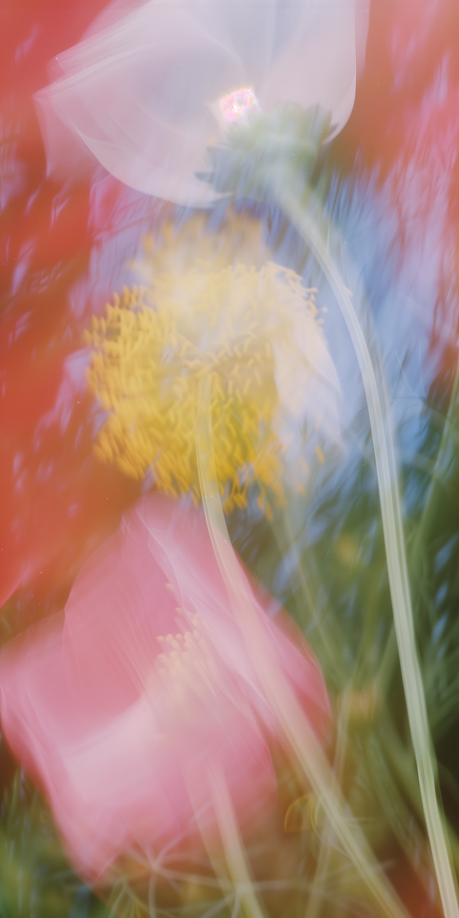 Abstract floral image with soft pastel hues of pink, yellow, and white, blending with green and red for a dreamy, painterly effect.