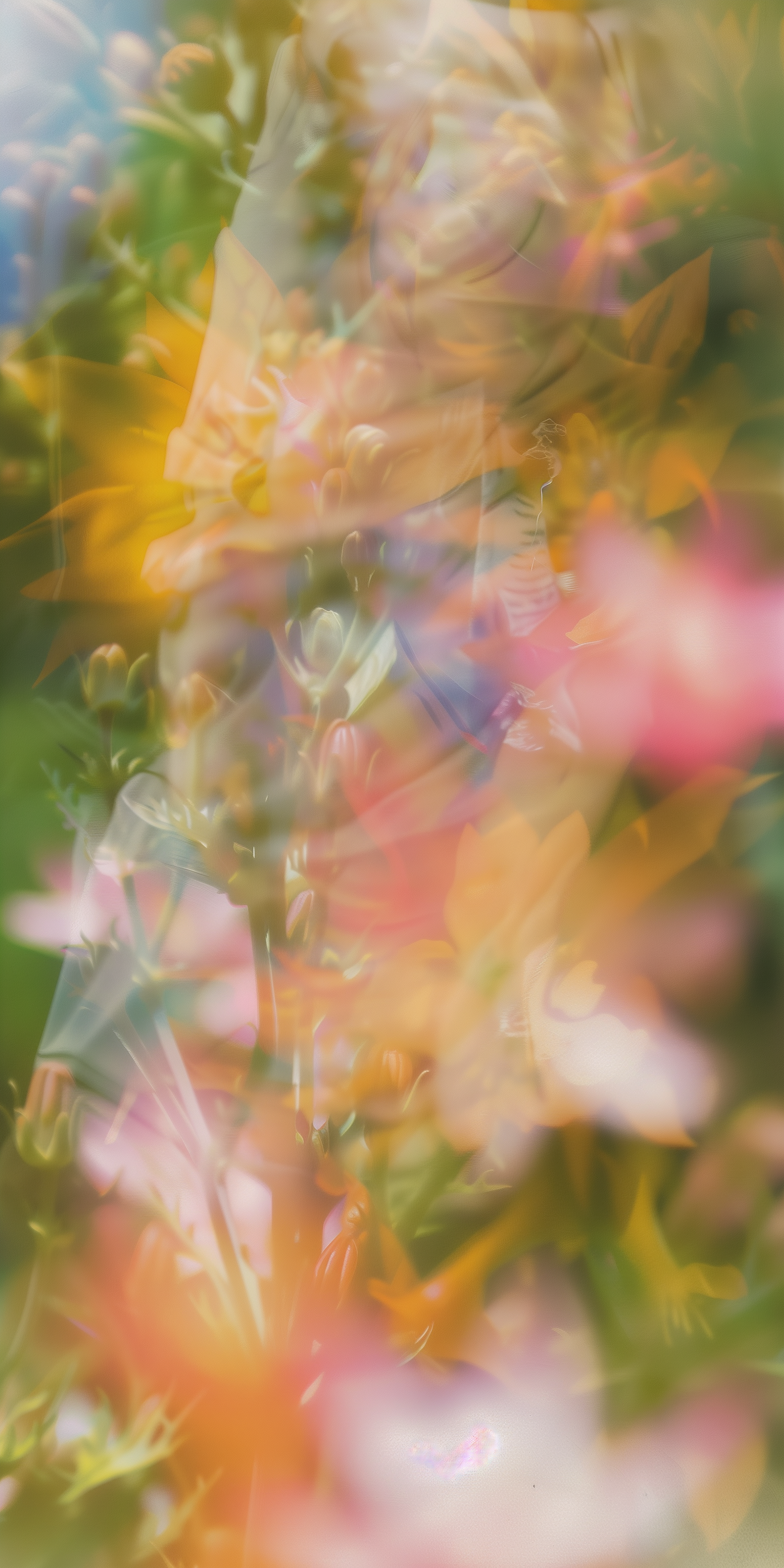 A dreamy, abstract floral composition with soft-focus blooms in vibrant yellow, pink, and green hues, creating a painterly, ethereal effect.