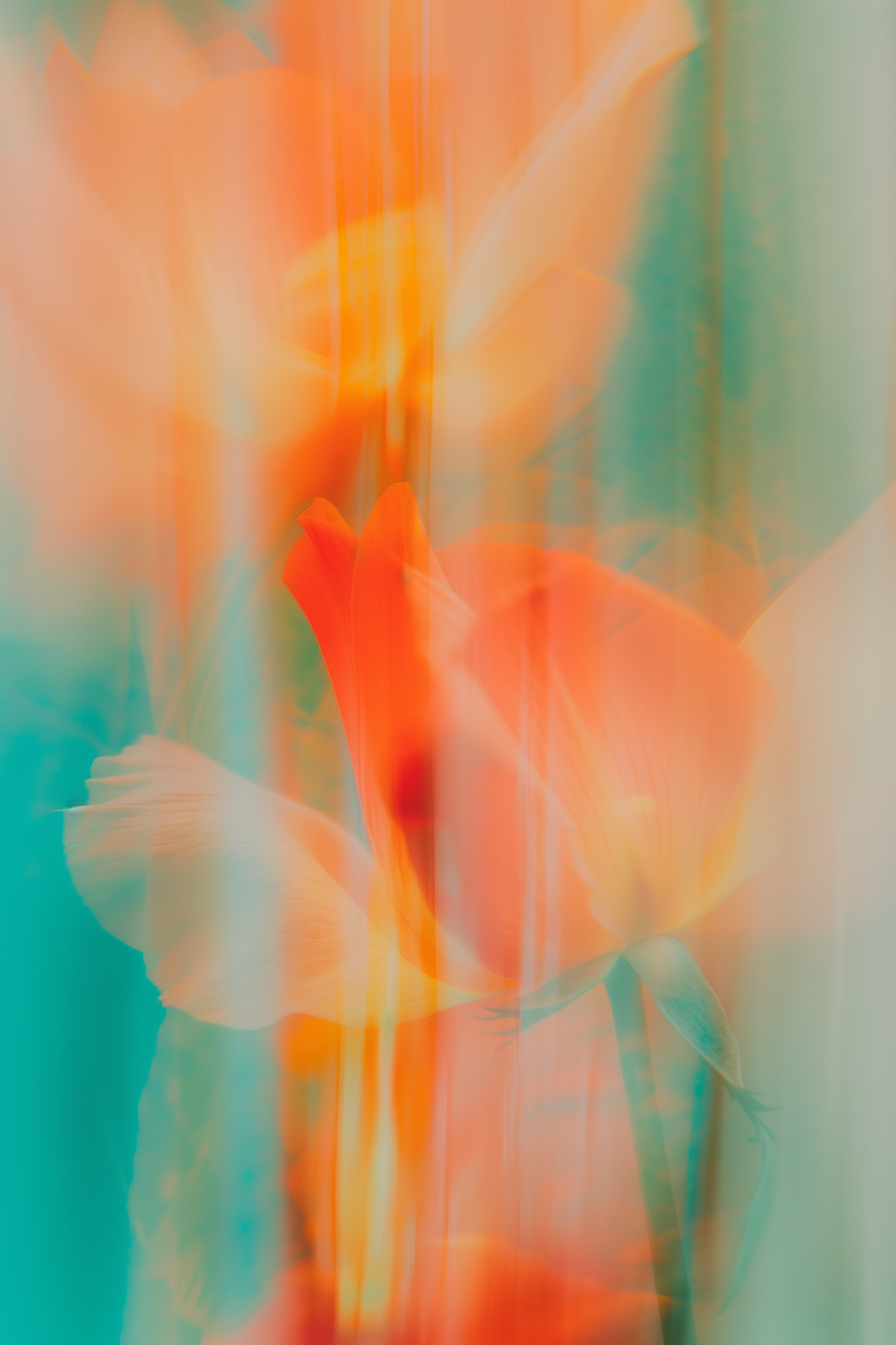 Abstract floral art with glowing orange and yellow flowers blending into teal and green hues, creating a dreamy, ethereal effect.