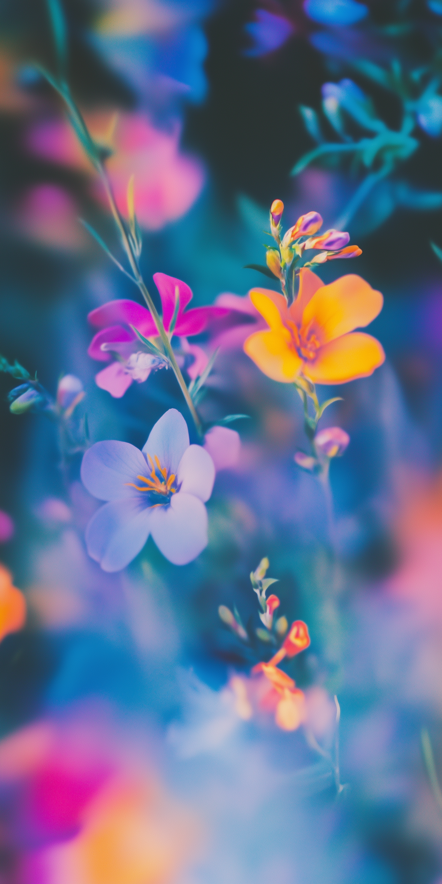 Dreamy close-up of vibrant flowers in soft focus, featuring yellow, pink, and purple blooms against a blurred green and blue background.
