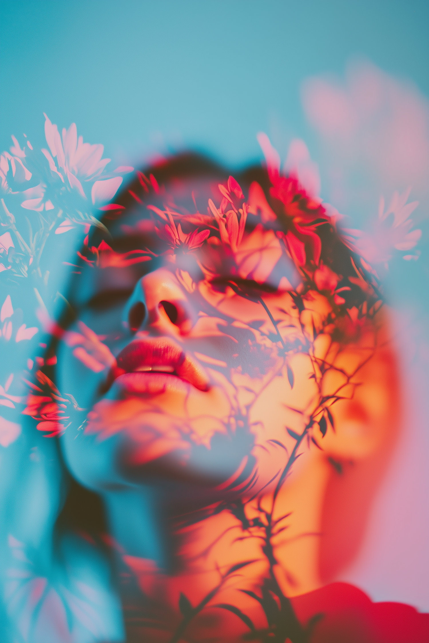 Surreal portrait with floral overlay, blending vibrant reds and blues. Dreamy and ethereal, with a serene expression and artistic flair.
