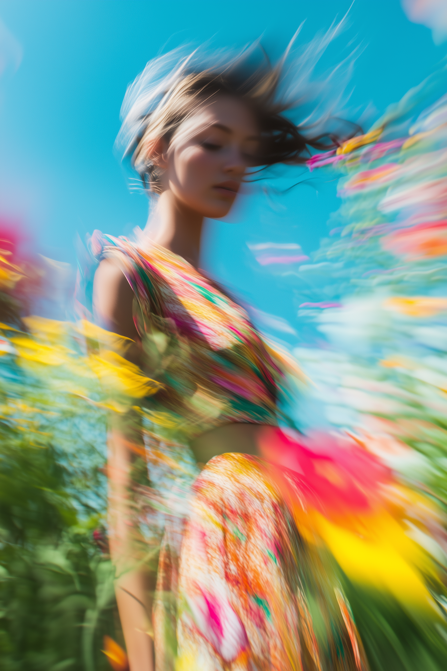 A dreamy, motion-blurred shot of a woman in a colorful outfit surrounded by vibrant flowers under a bright blue sky.