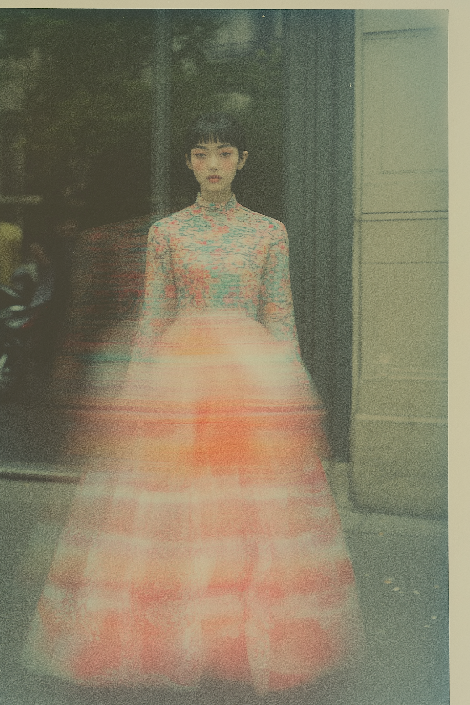 A dreamy portrait of a woman in a floral dress with a flowing, blurred skirt, set against a reflective urban backdrop.