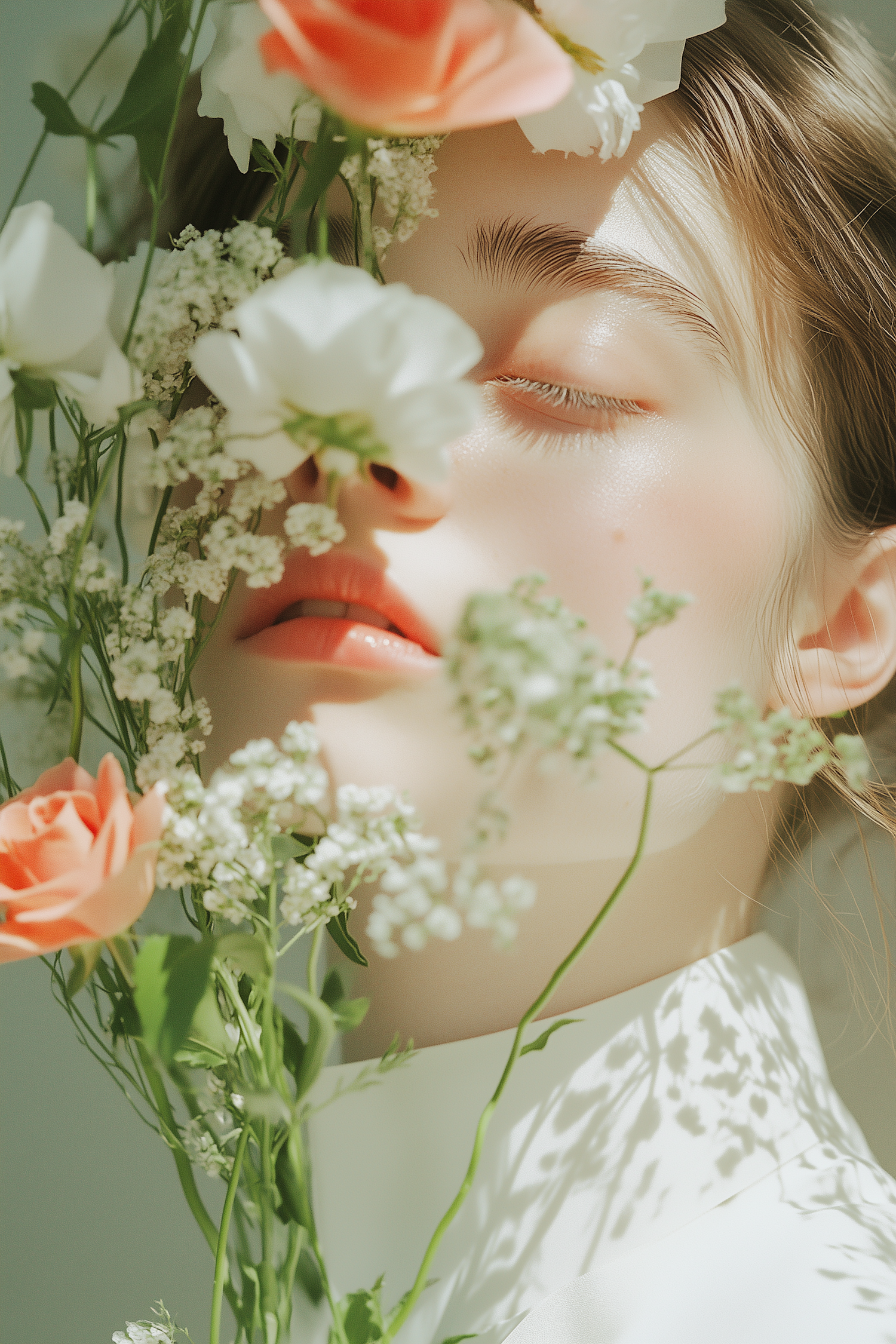 Dreamy close-up of a woman with closed eyes surrounded by delicate white and peach flowers, creating a serene and ethereal vibe.