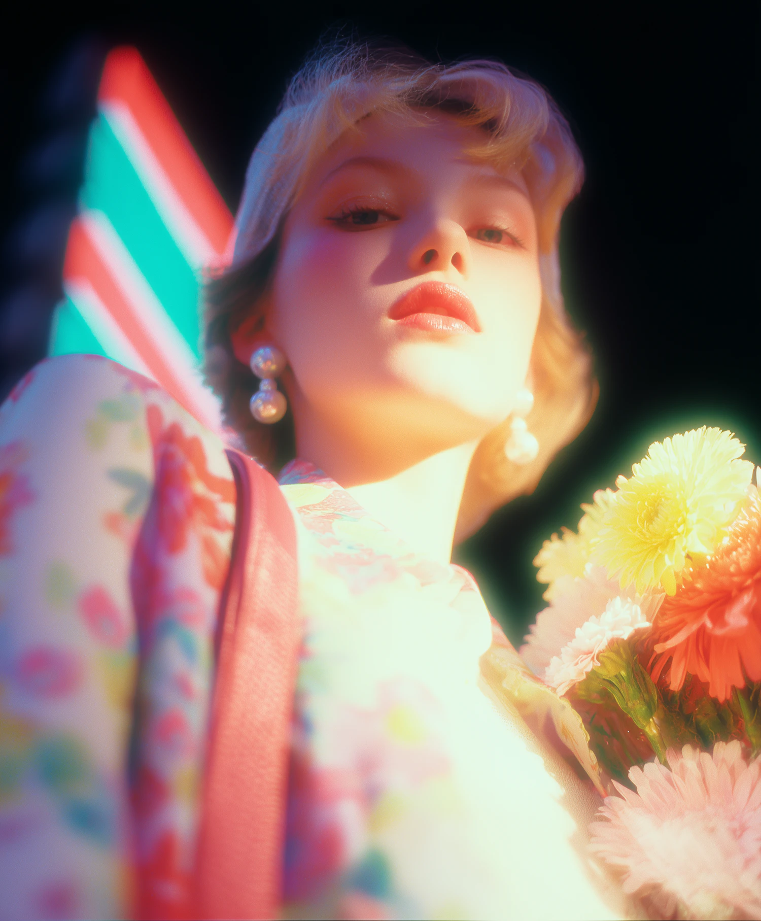 A dreamy portrait of a young woman with blonde hair, holding flowers, set against a neon-lit urban background.