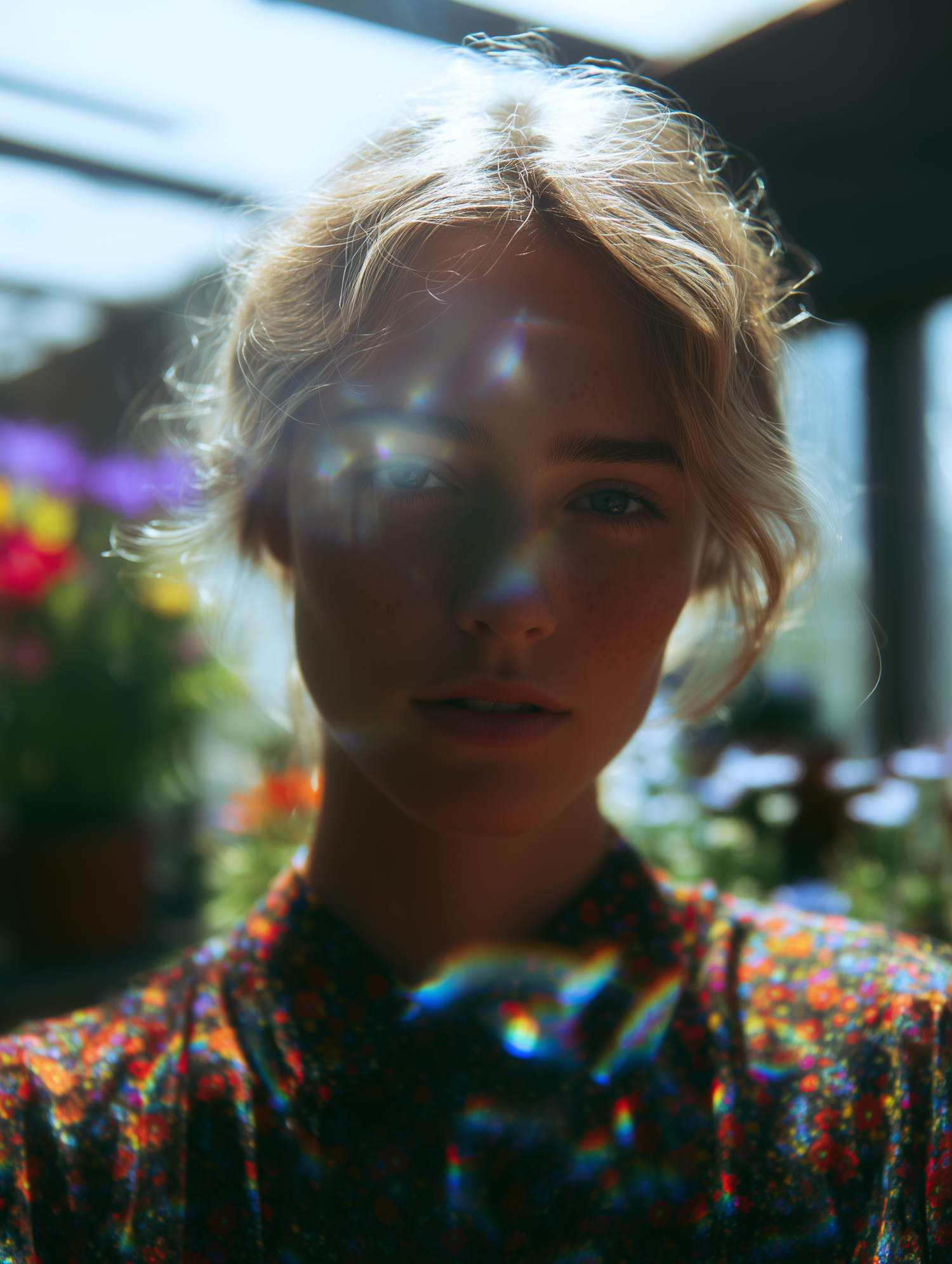 Dreamy portrait of a blonde woman in soft sunlight, wearing a floral dress with a blurred garden background and prism light effects.