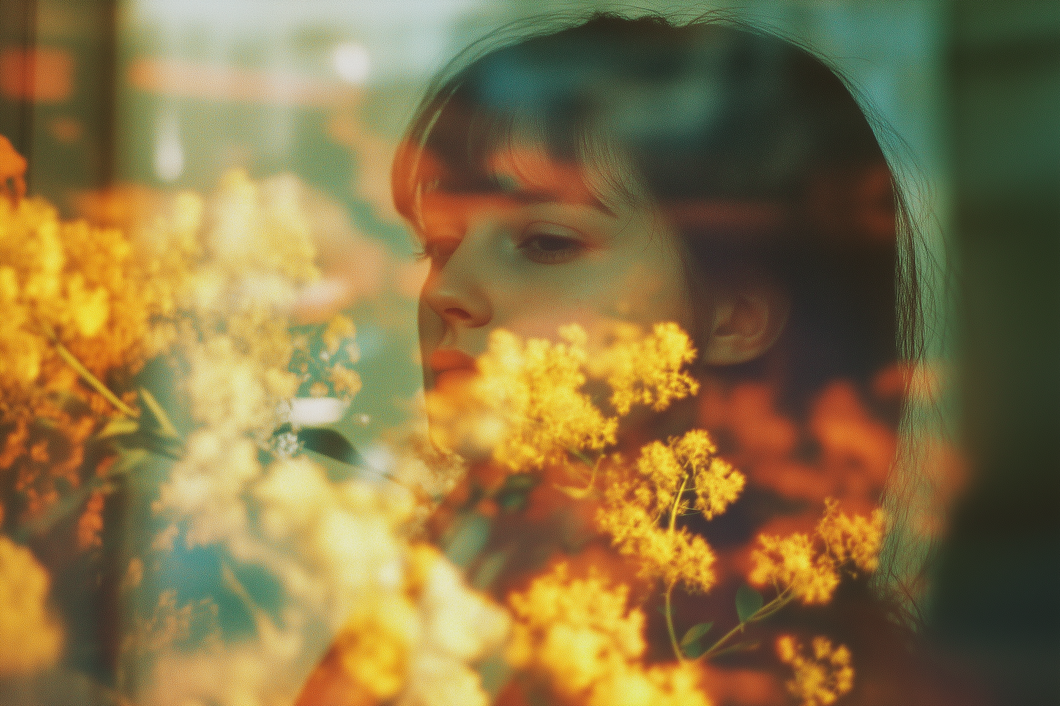 Dreamy portrait of a woman with yellow flowers and reflective light, blending vibrant hues and soft tones for a serene, ethereal vibe.