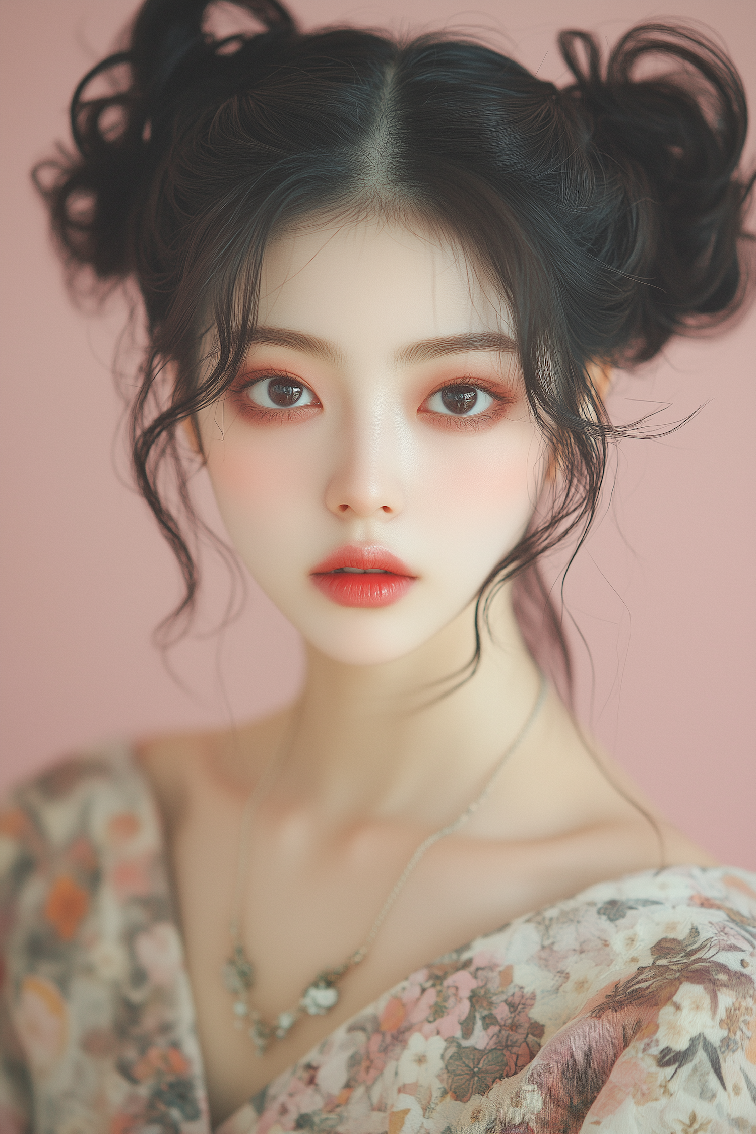A serene portrait of a young woman with floral attire, soft makeup, and a pink background, exuding elegance and charm.