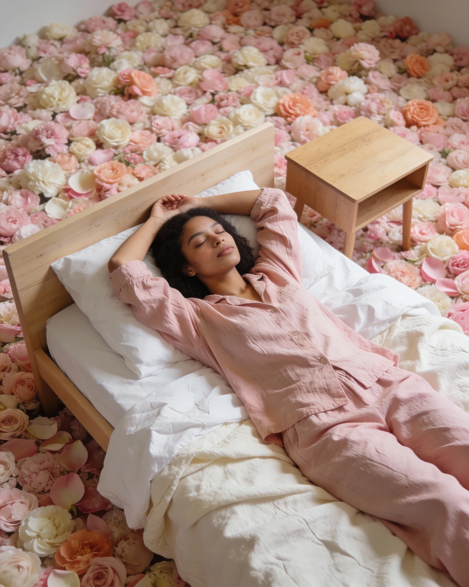 studio photography, soft diffused light, calm atmosphere, neutral lighting, realistic rendering, natural proportions, no dramatic contrast, everyday mood, high-end lookbook photography, woman lying on a wooden bed, arms above the head, eyes closed, relaxed body, wearing a loose pastel pink cotton pajama, white and cream cotton bedding with visible wrinkles, simple wooden bed frame, small wooden bedside table next to the bed, flowers placed on the floor around the bed, flowers placed behind the bed forming a dense floral background, flowers filling the entire visible background, no walls visible, no studio equipment visible, soft pink, cream and peach flowers, natural cotton fabric textures