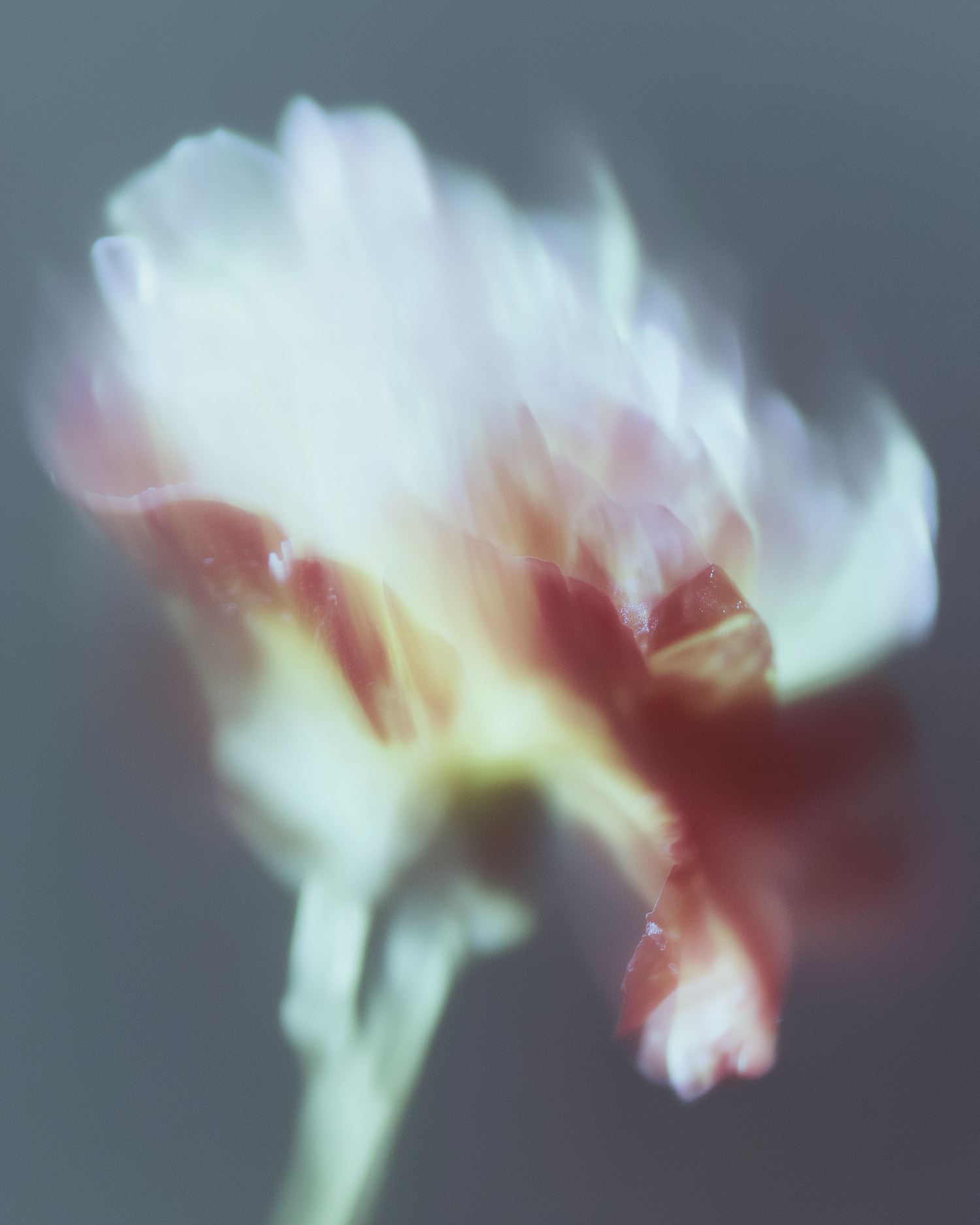 A dreamy close-up of a flower with soft focus, showcasing white, red, and yellow hues against a muted gray background.