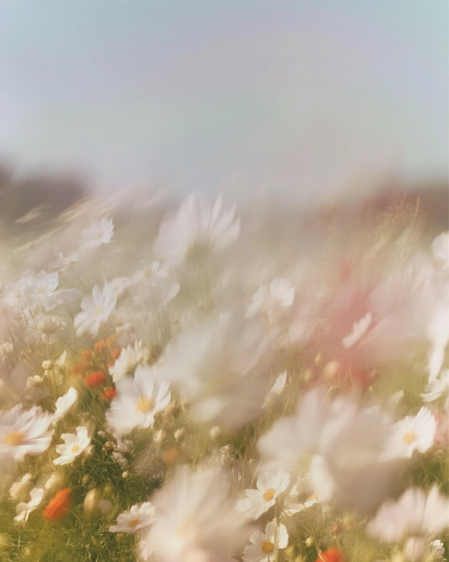 A dreamy field of white and orange flowers softly blurred, creating a serene and ethereal atmosphere under warm sunlight.