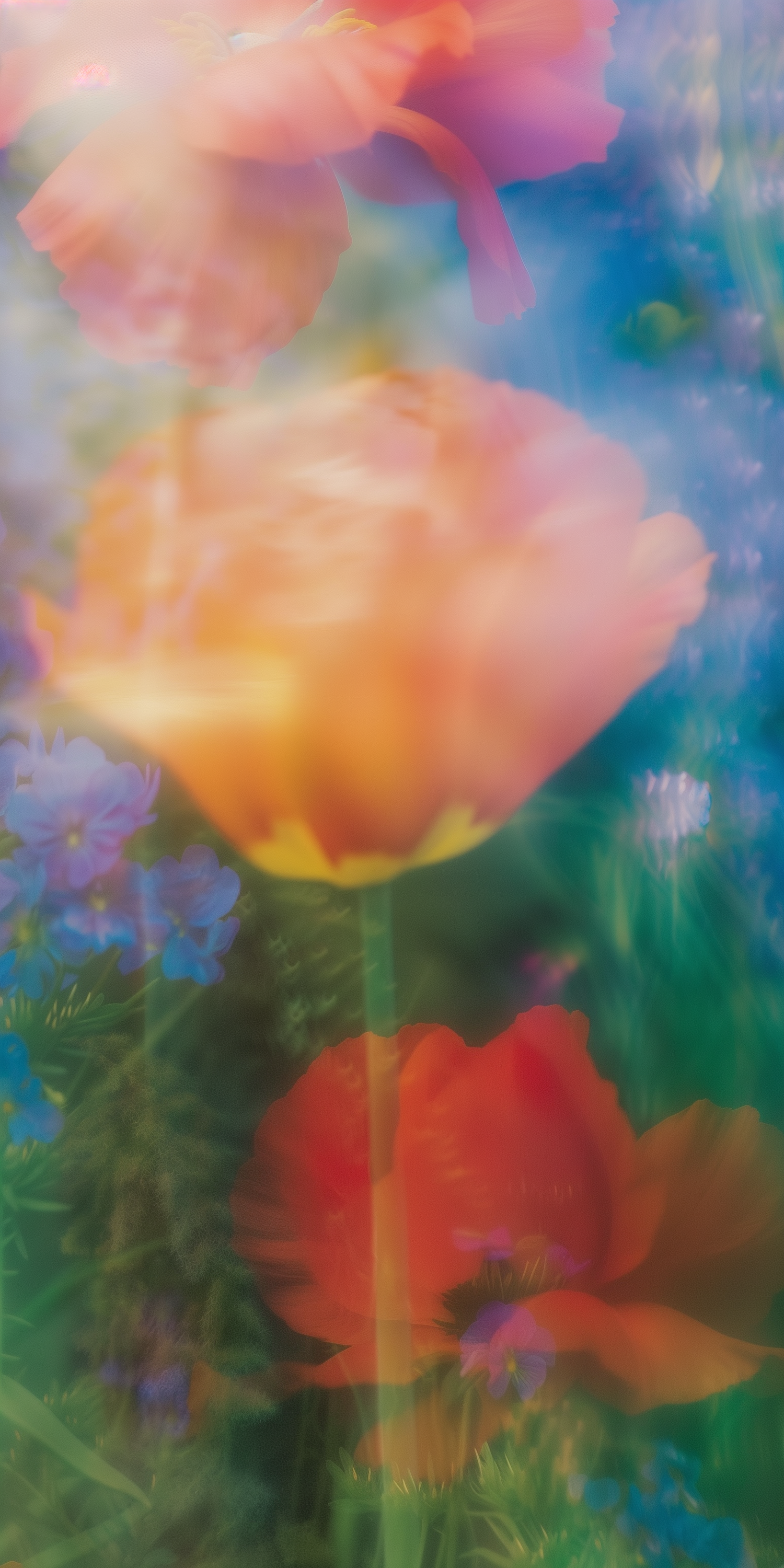 Dreamy, soft-focus image of orange, red, and blue flowers in a garden, creating a serene and ethereal atmosphere.