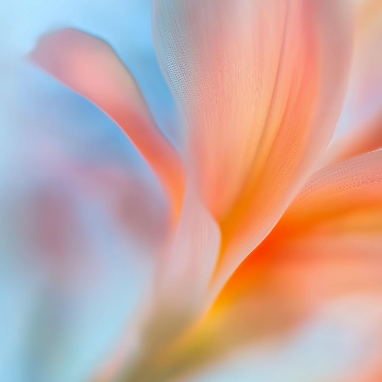 Dreamy macro shot of a flower petal with soft orange, pink, and blue tones, creating a serene and abstract aesthetic.