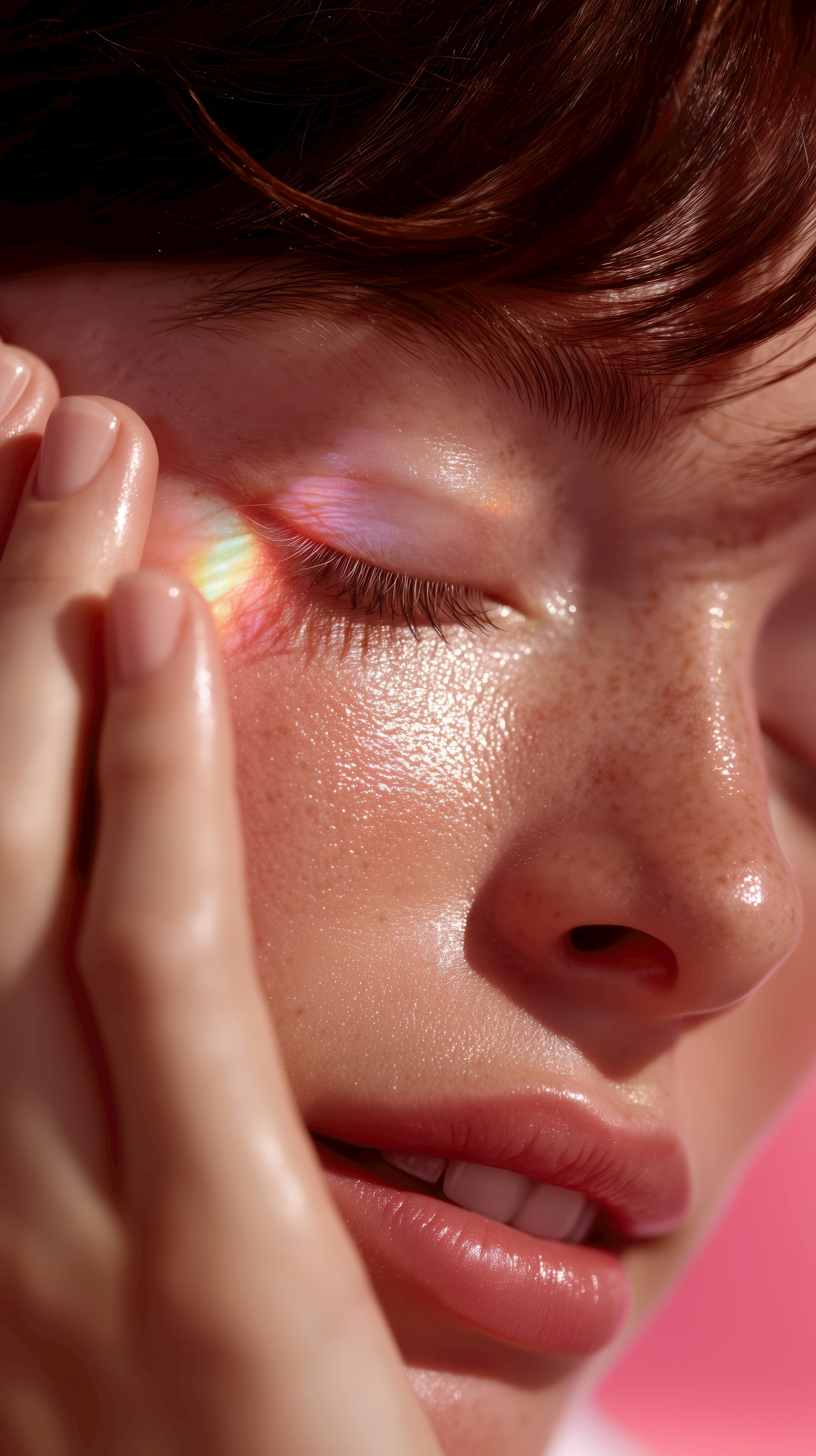 Close-up of a freckled face with dewy skin, closed eyes, and a rainbow light reflection on the eyelid. Soft pink background adds warmth.