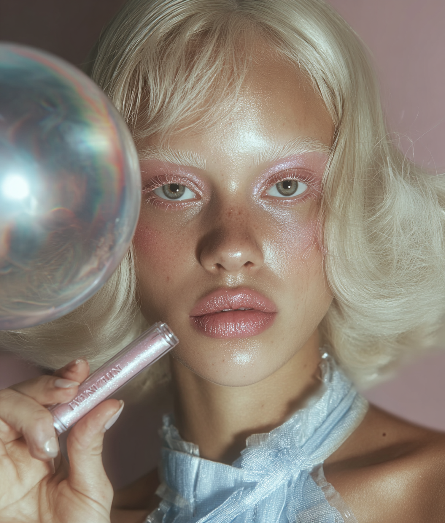 Close-up of a person with platinum blonde hair and shimmering pink makeup, holding a Revolution lip gloss in a dreamy, pastel setting.