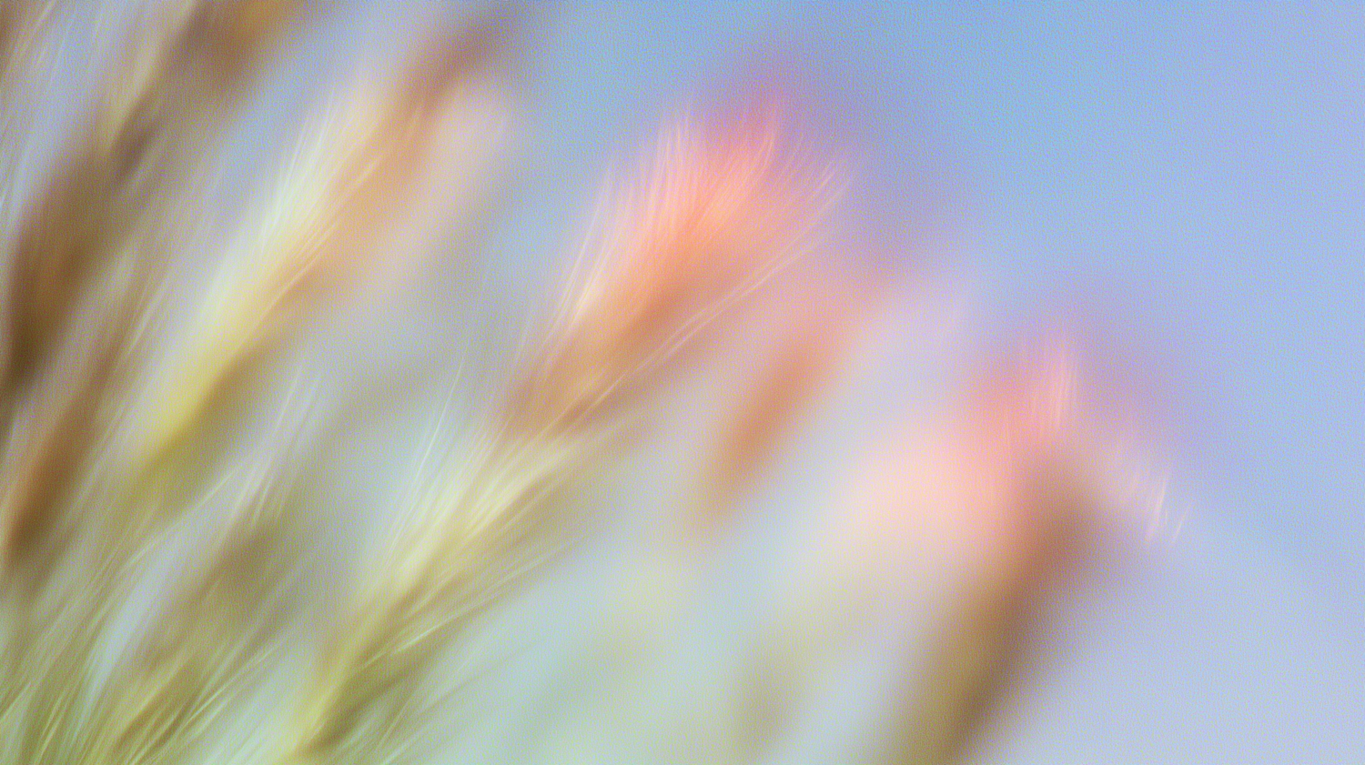 Dreamy, blurred image of pastel-colored grass swaying against a soft blue sky, creating a tranquil and abstract aesthetic.