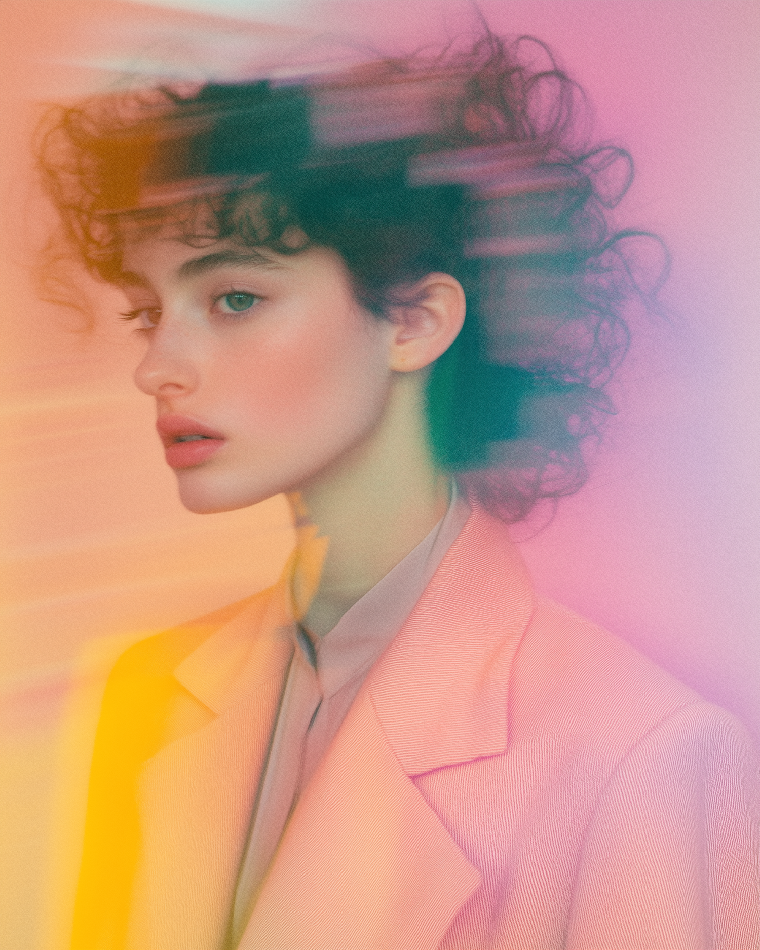 A dreamy portrait of a young woman in a pink blazer, set against a pastel background with a soft, ethereal blur effect.