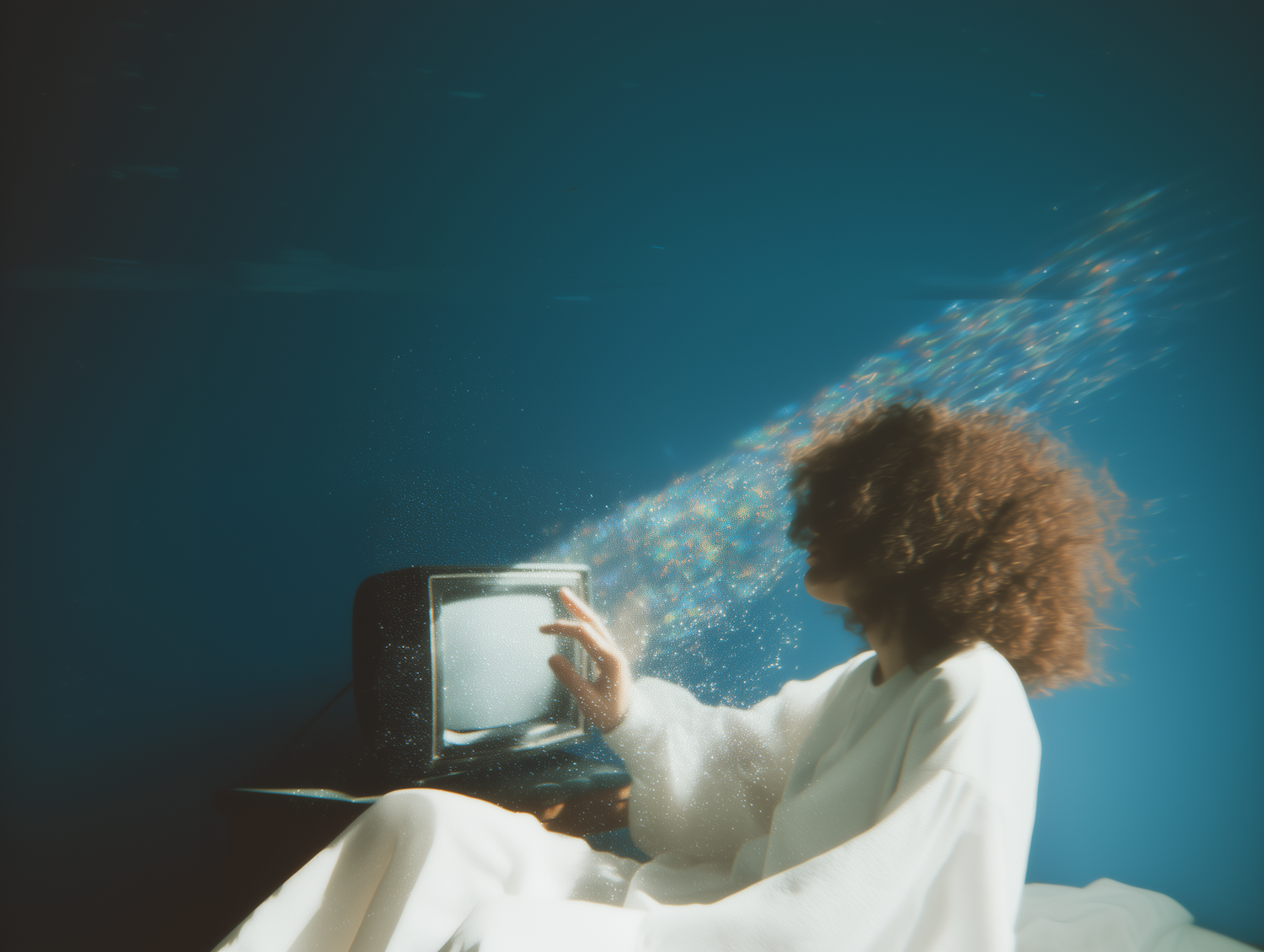 A dreamy scene of a person interacting with a glowing vintage TV, surrounded by ethereal light and a serene blue background.
