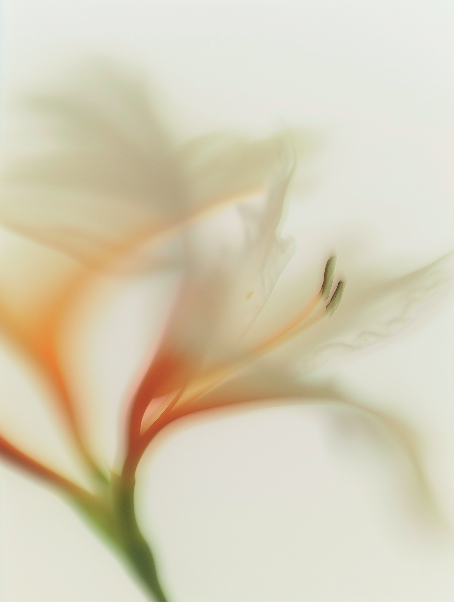 A dreamy, soft-focus close-up of a white lily with orange accents, creating a serene and ethereal floral composition.