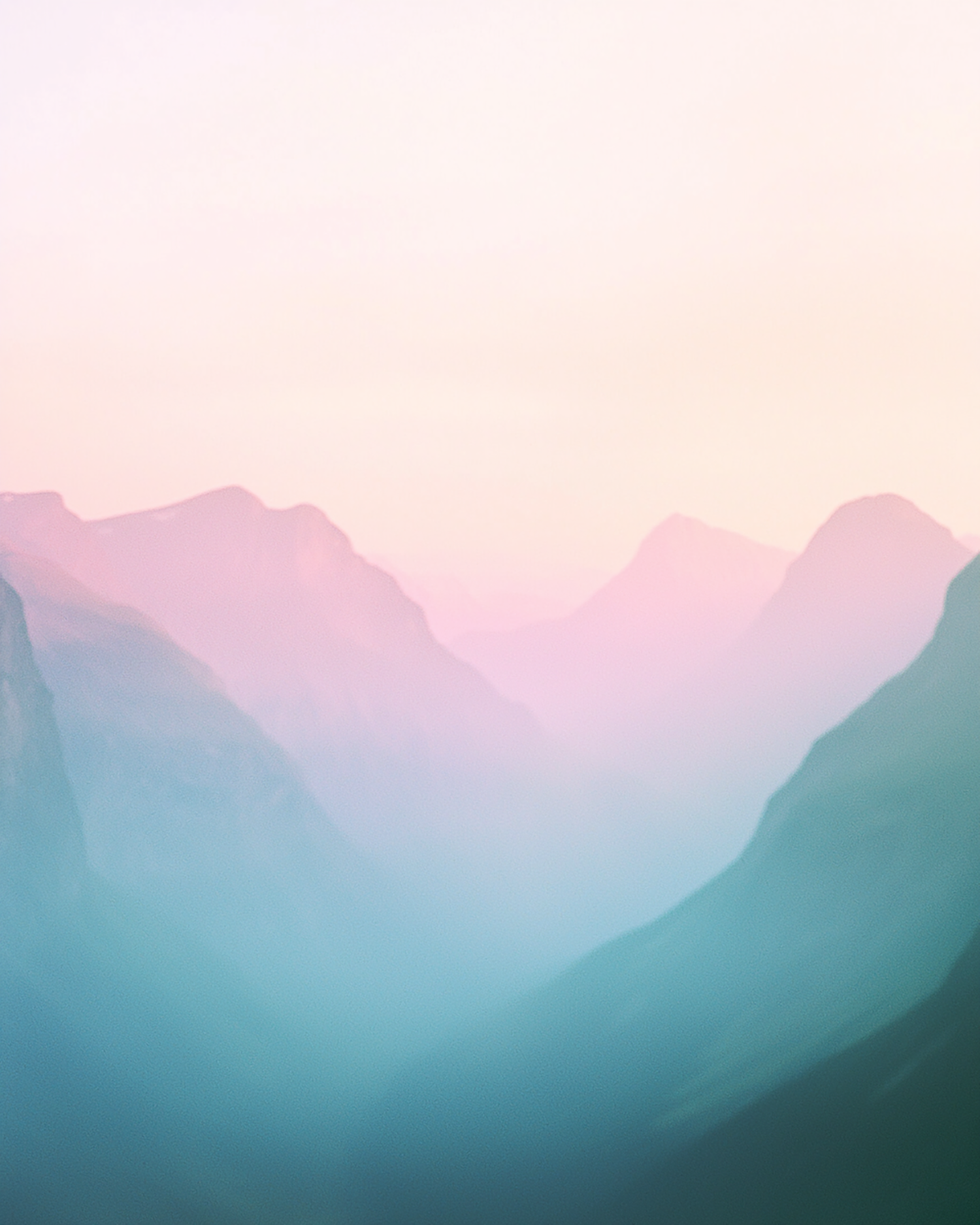 Dreamy pastel mountain landscape with soft pink, purple, and blue hues, creating a serene and ethereal atmosphere.