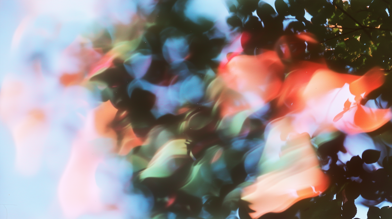 Abstract image of sunlight filtering through tree leaves, blending vibrant red, orange, green, and blue hues in a dreamy, soft-focus effect.