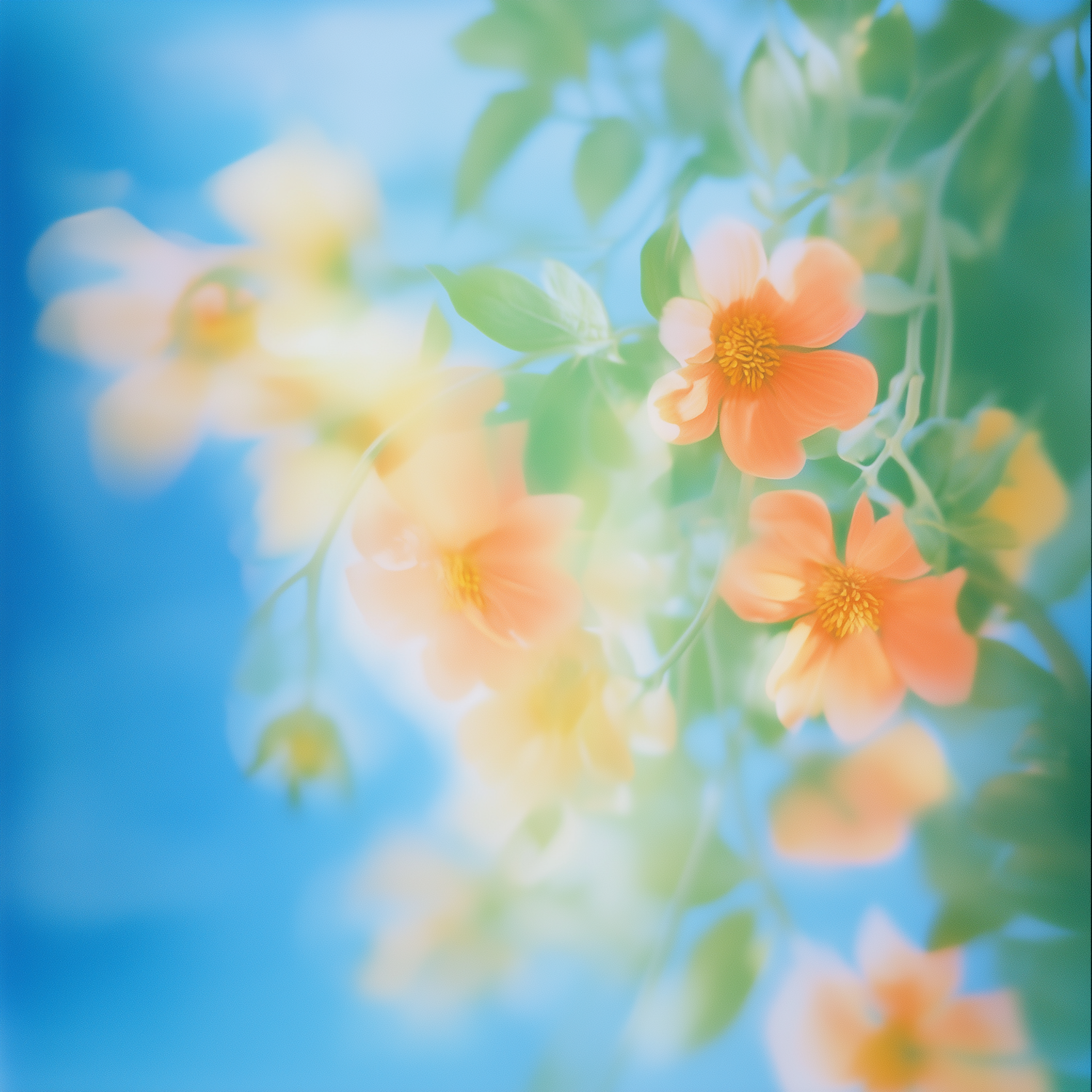 Dreamy orange flowers with lush green leaves against a soft blue background, creating a serene and ethereal vibe.