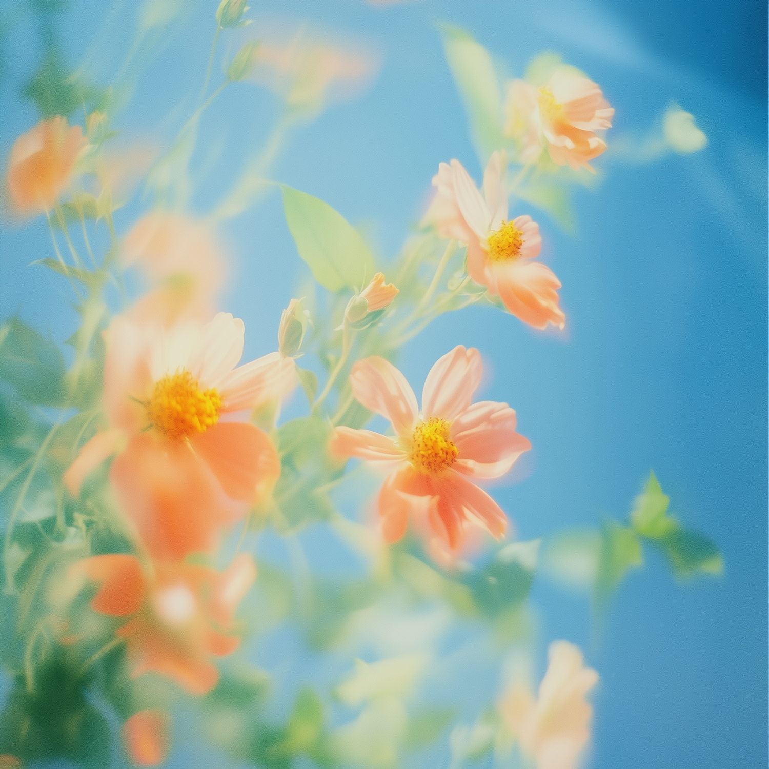 Dreamy orange flowers with yellow centers and green leaves against a vibrant blue background, creating a serene and ethereal vibe.
