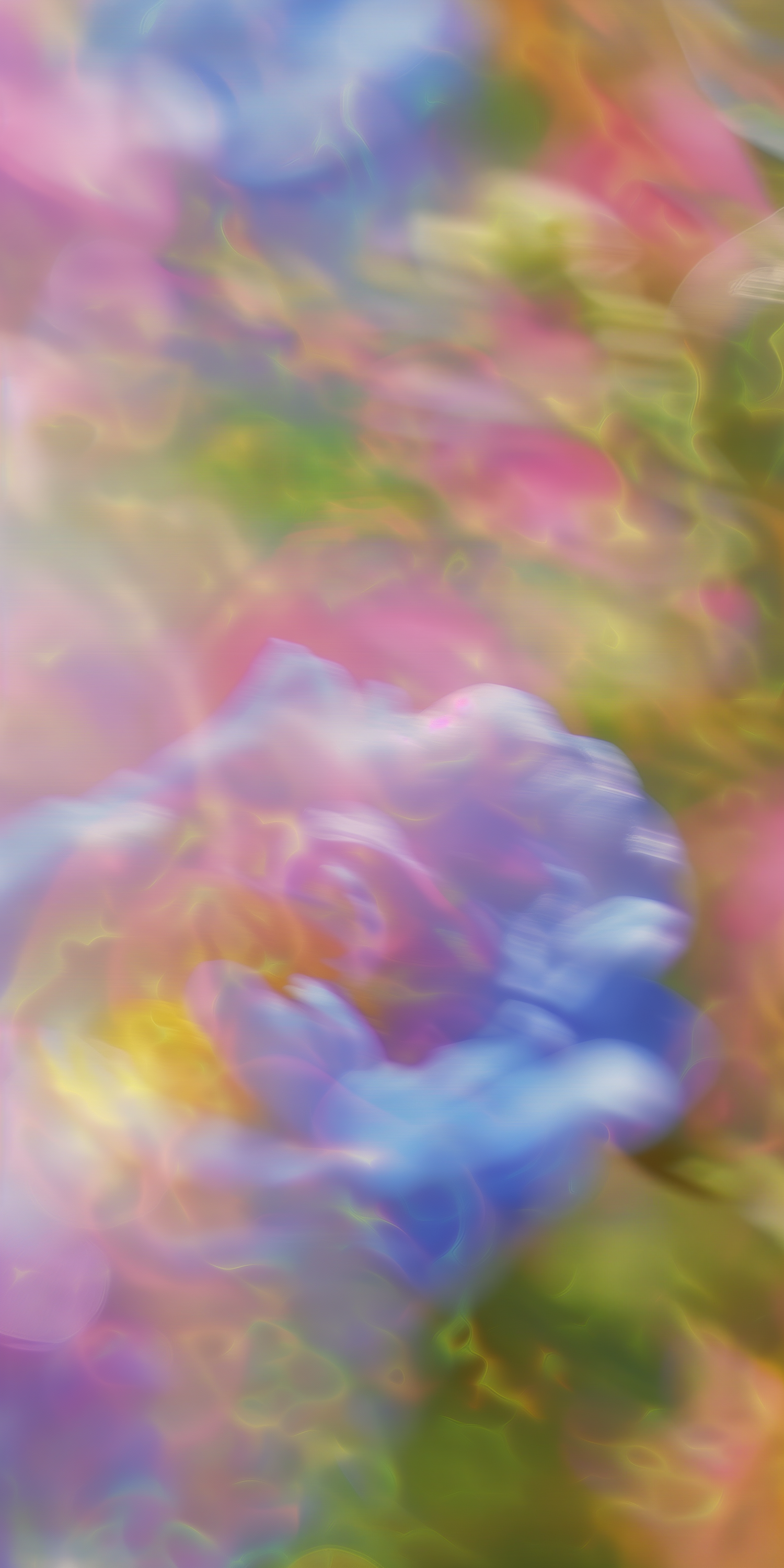 A dreamy abstract blend of pastel pinks, blues, yellows, and greens, resembling a blurred floral scene with fluid, watercolor-like textures.
