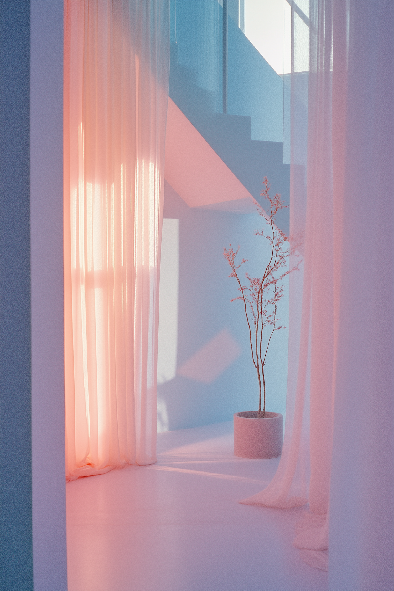 A dreamy pastel-lit room with sheer curtains, a minimalist staircase, and a delicate potted plant creating a serene ambiance.