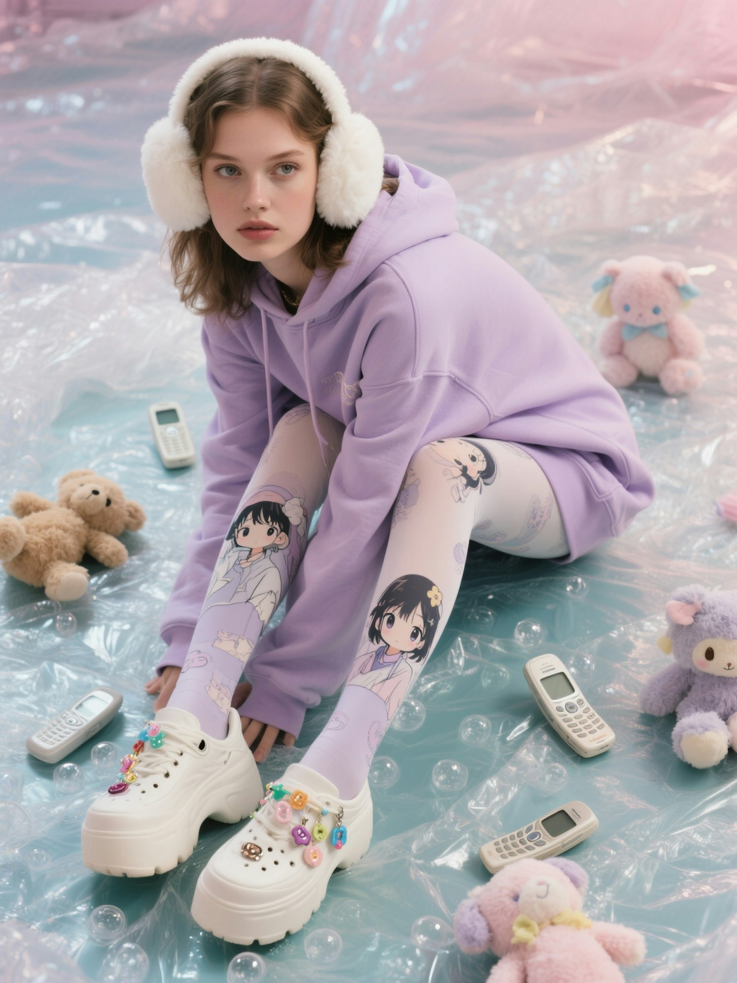 pastel chic outfit with oversized lavender hoodie, anime character print tights, fluffy earmuffs, chunky sneakers with charms, model kneeling on bubble wrap floor, top-down camera view, surrounded by plush toys and flip phones --v 6 --ar 9:16